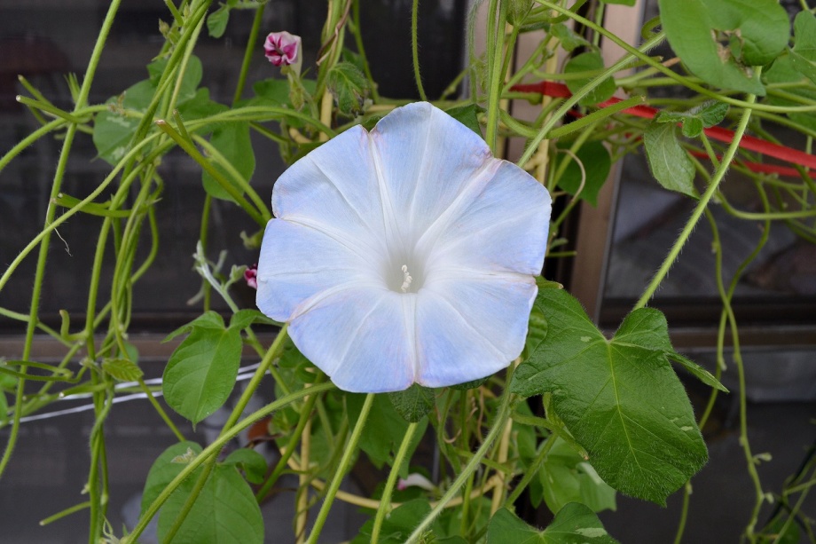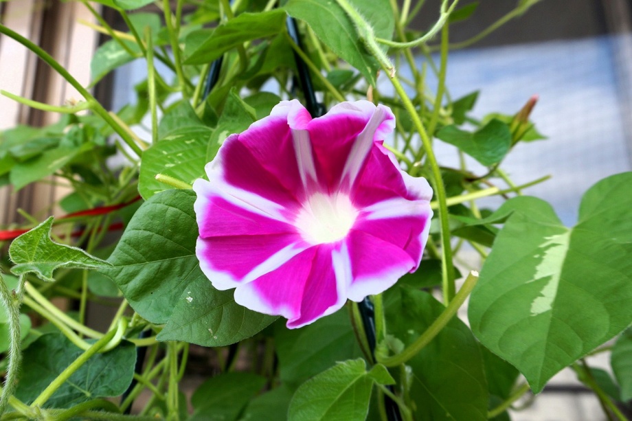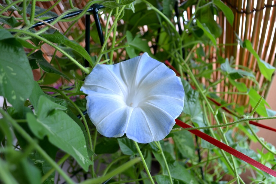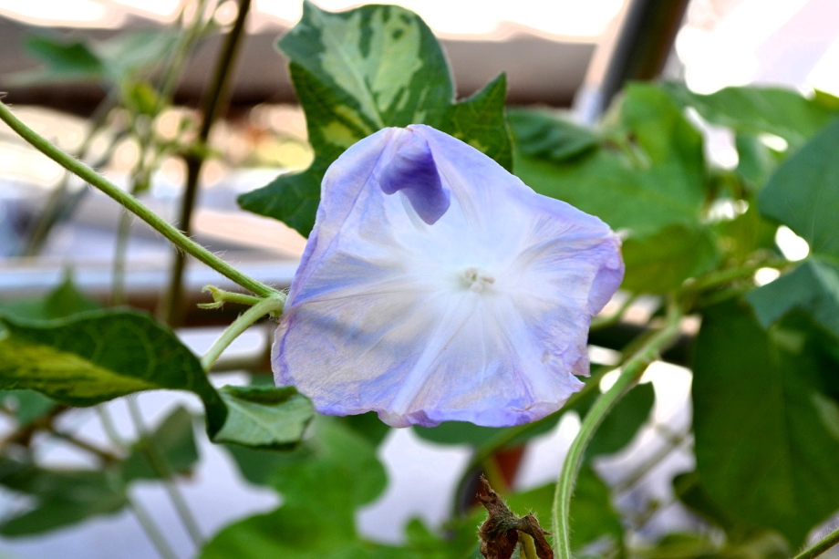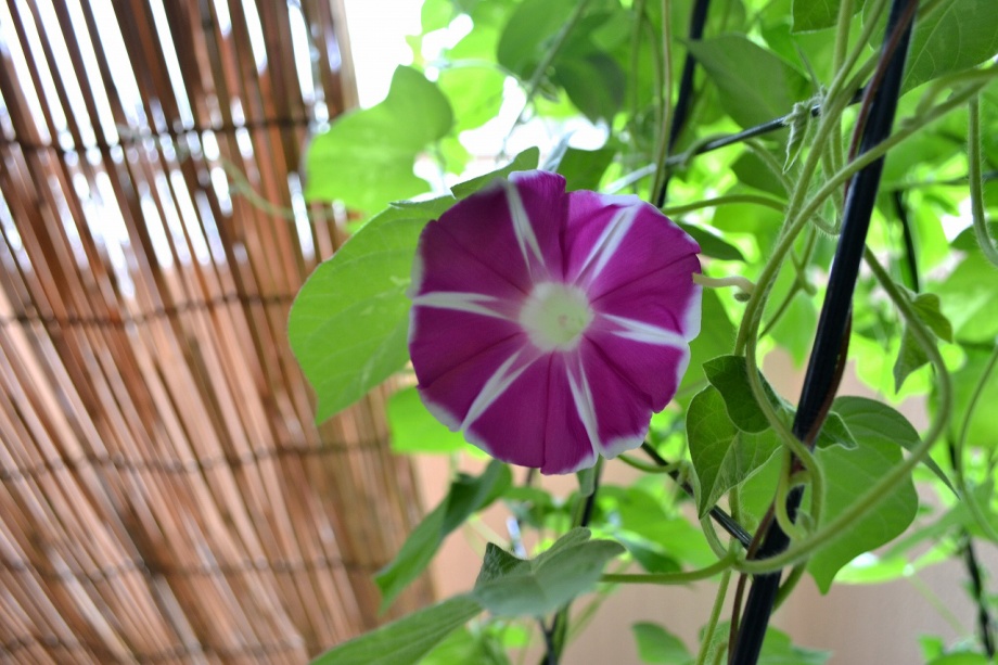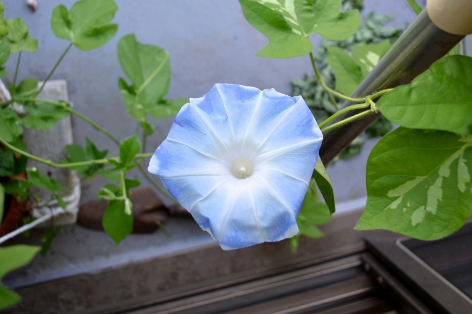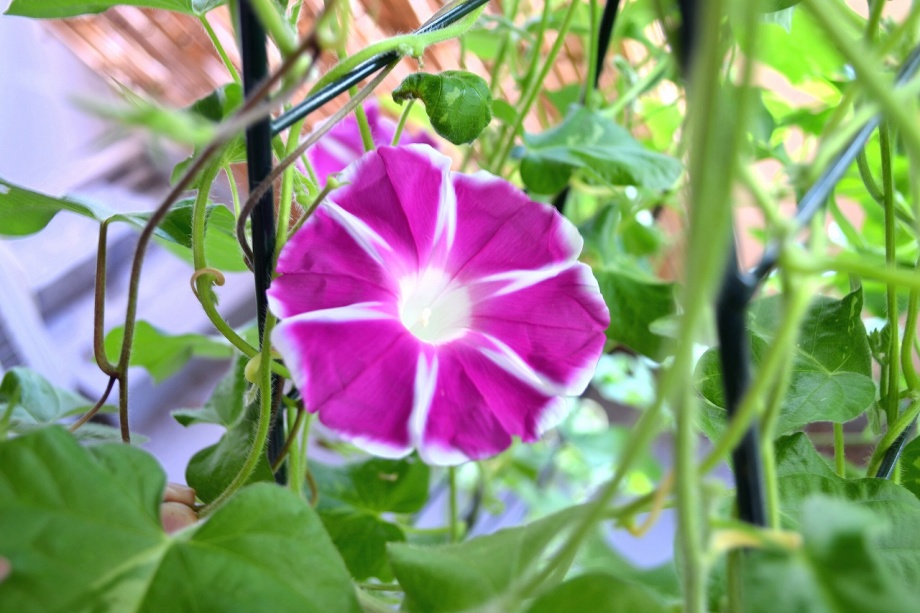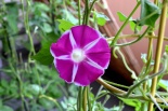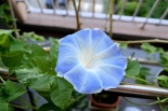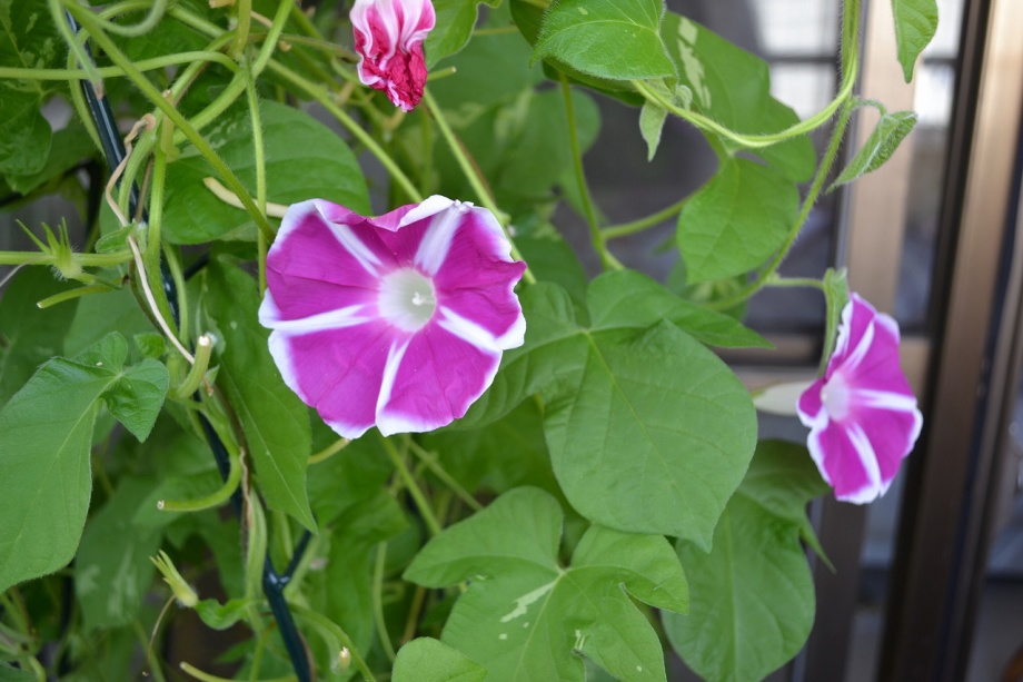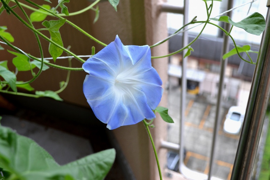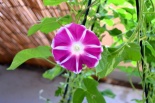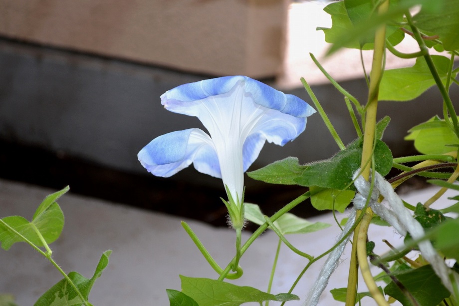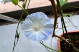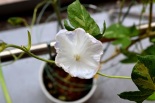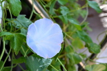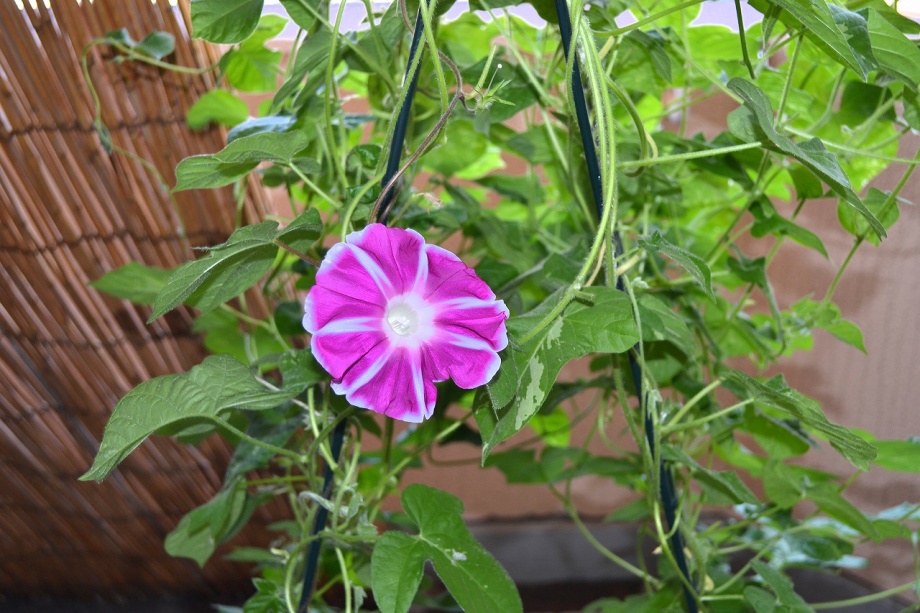 しましたので、朝顔が枯れるかと思いましたが、16日に花が咲きました。しかし、朝顔は傷んでいて、綺麗な花は少なくなっています。22日の台風の中でも一輪の