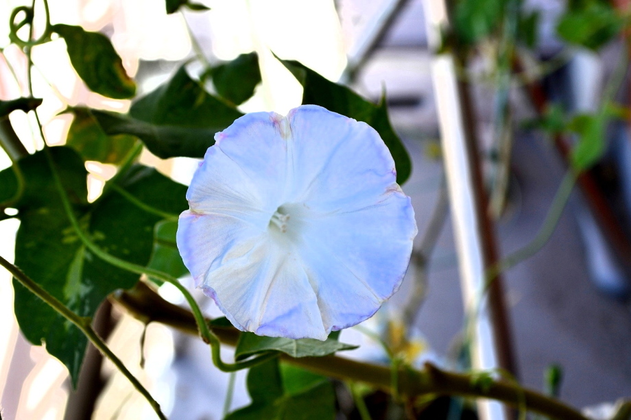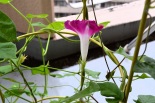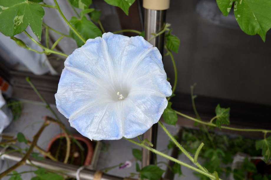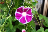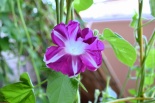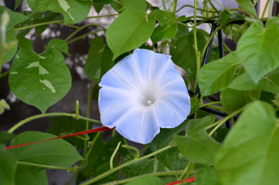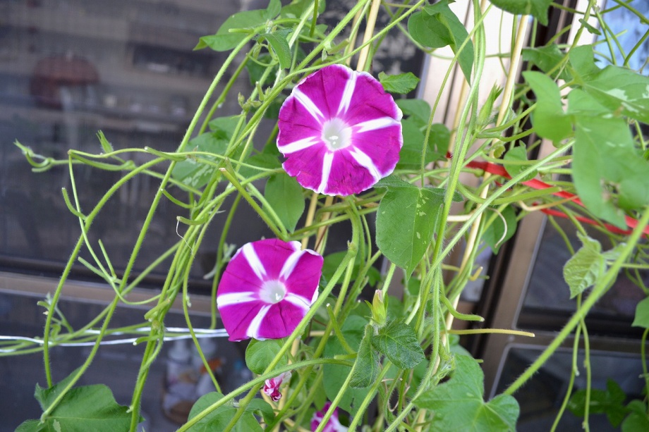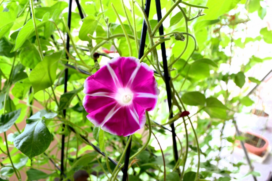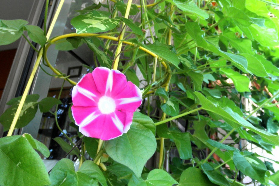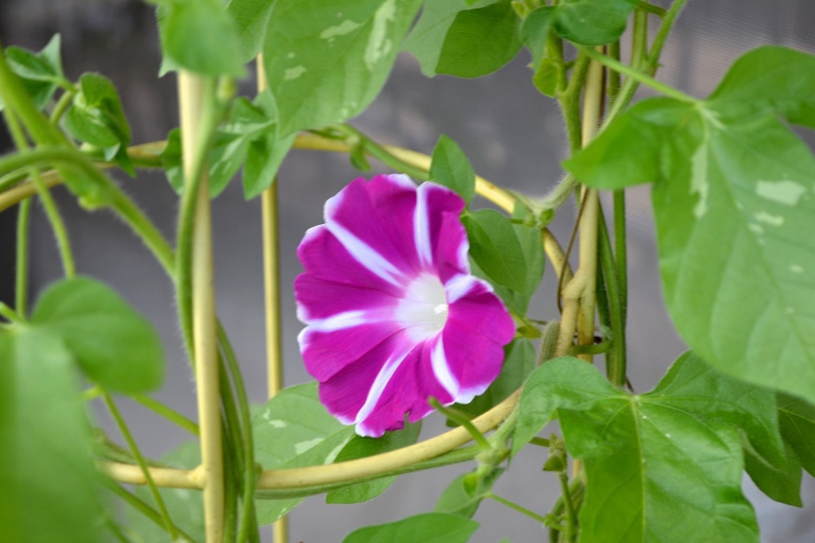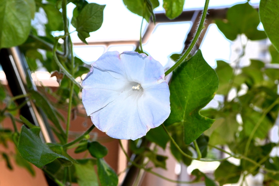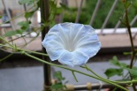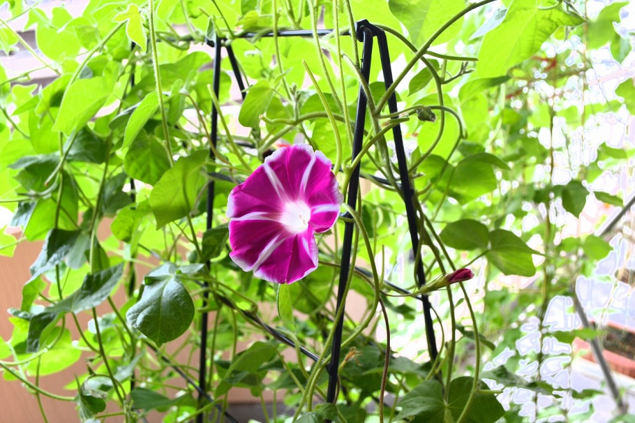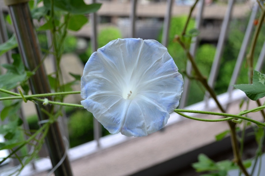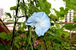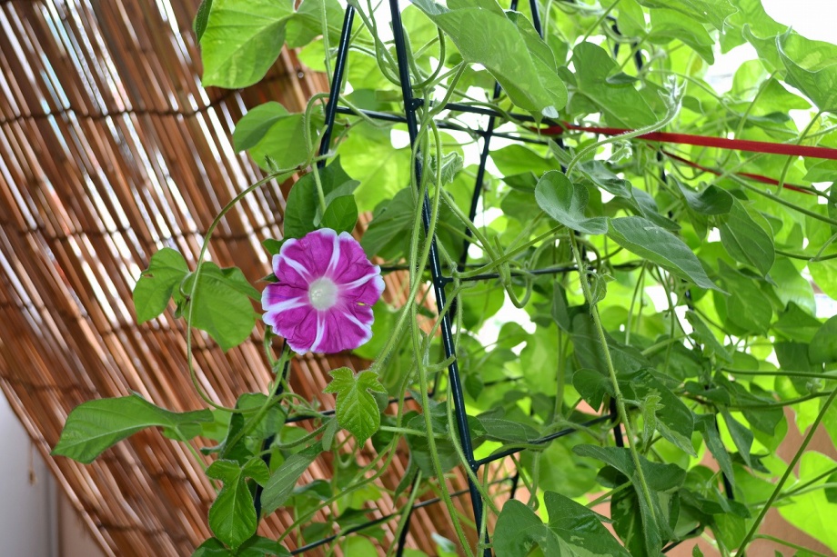 しましたので、朝顔が枯れるかと思いましたが、16日に花が咲きました。しかし、朝顔は傷んでいて、綺麗な花は少なくなっています。22日の台風の中でも一輪の
