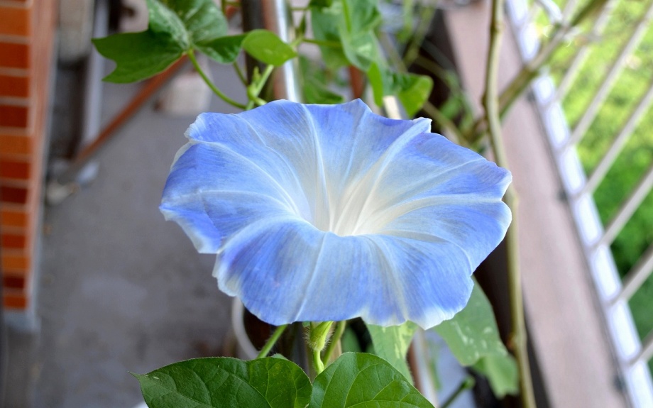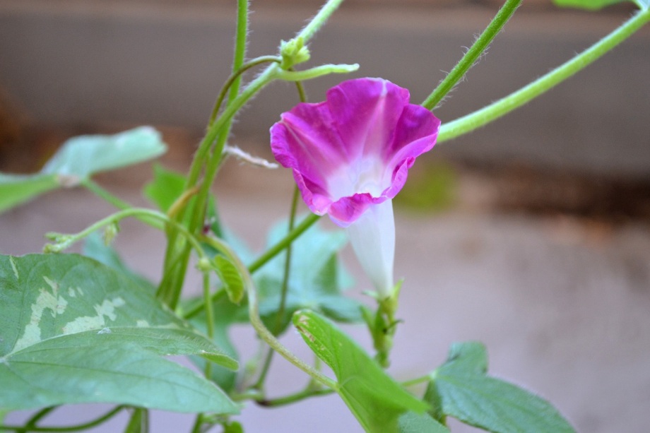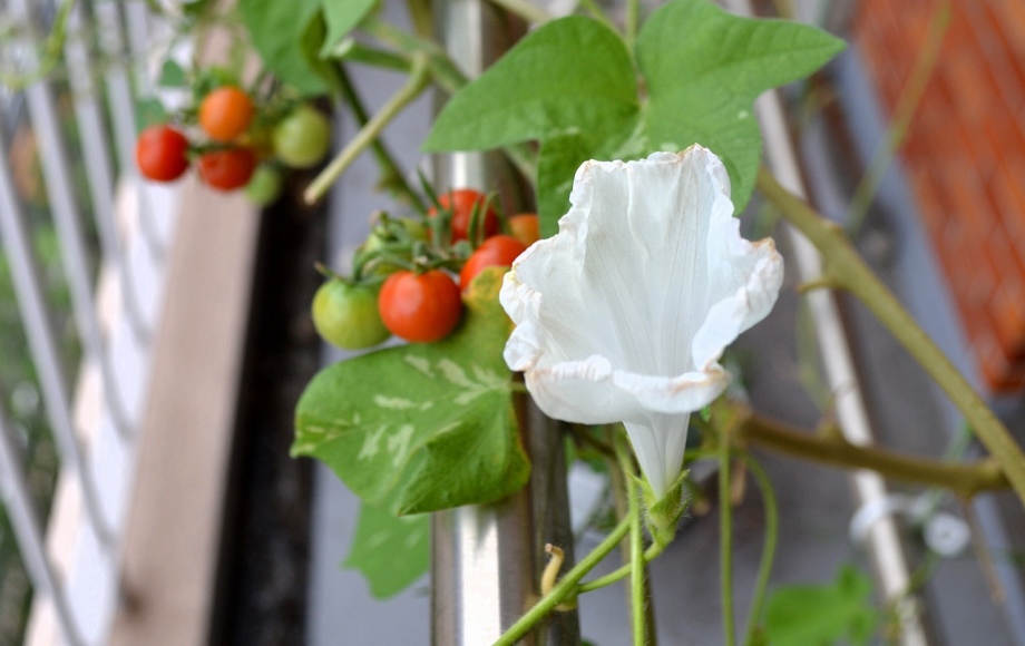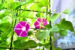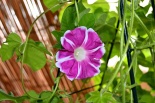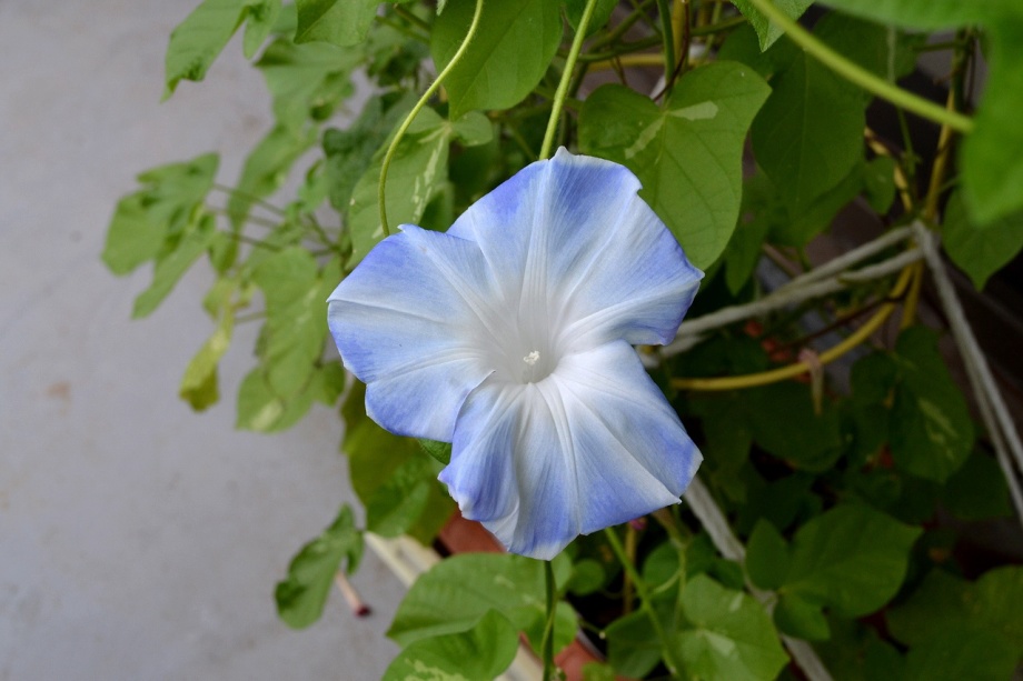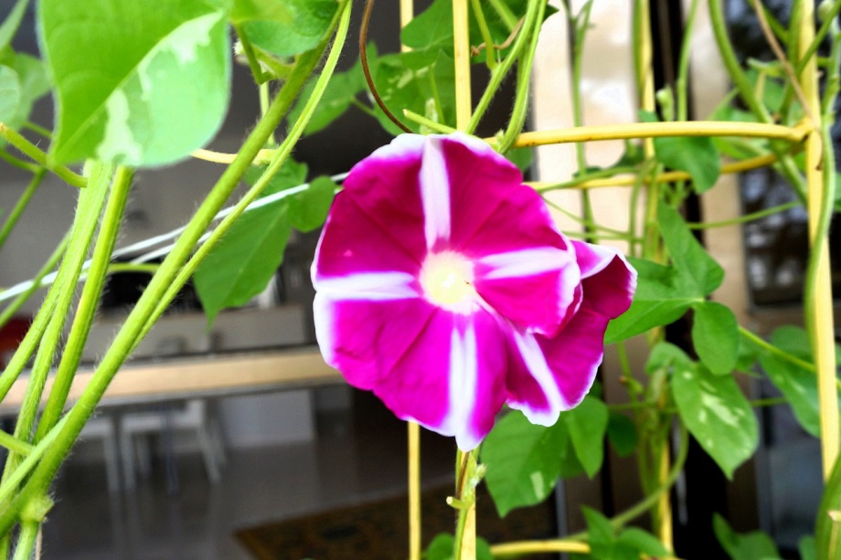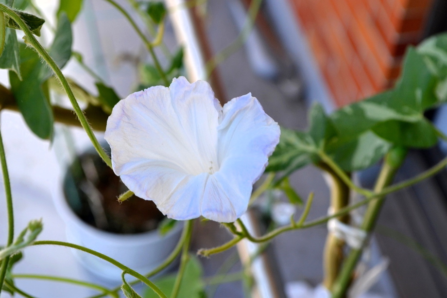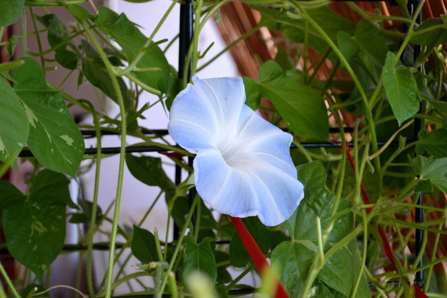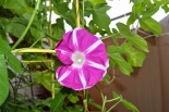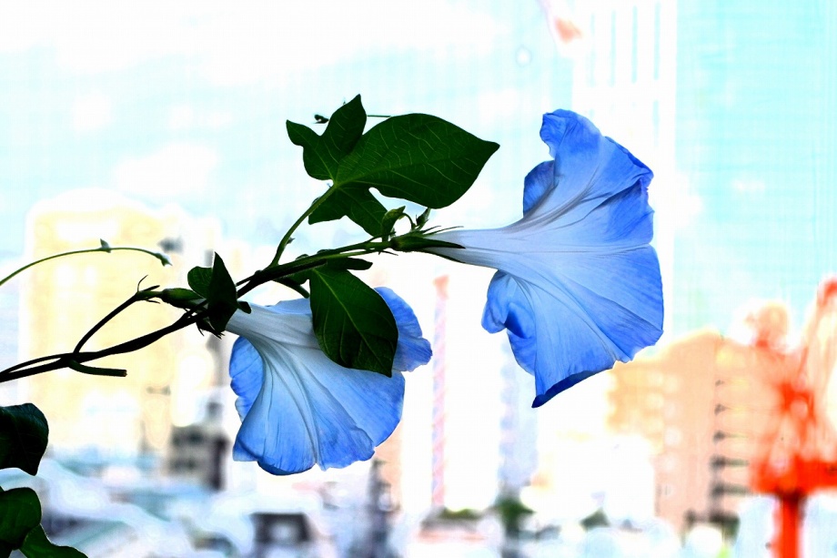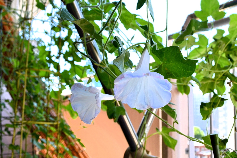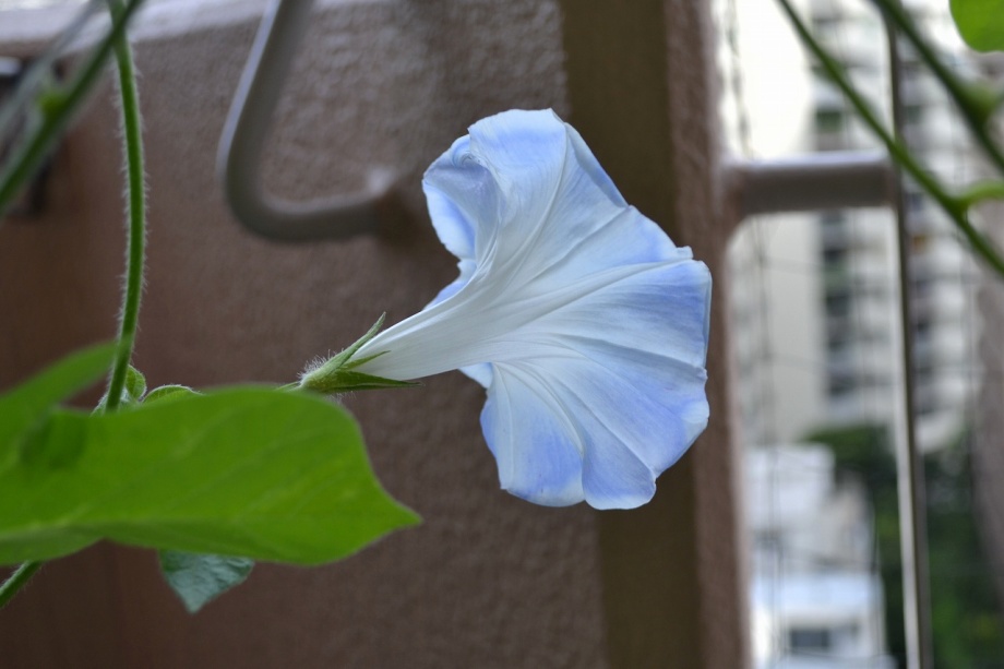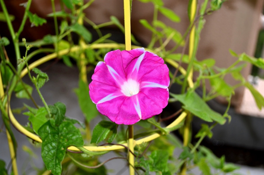 しましたので、朝顔が枯れるかと思いましたが、16日に花が咲きました。しかし、朝顔は傷んでいて、綺麗な花は少なくなっています。22日の台風の中でも一輪の