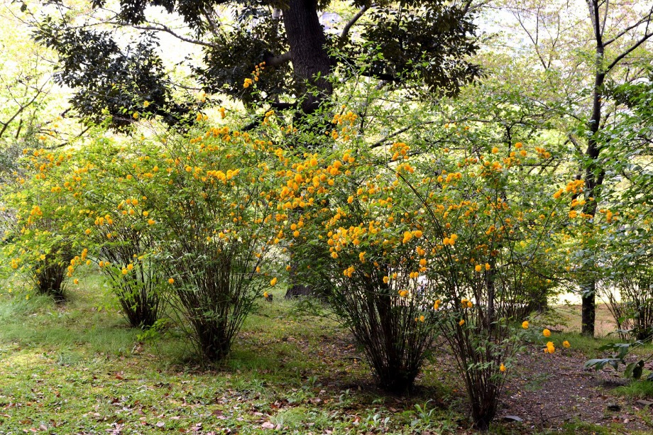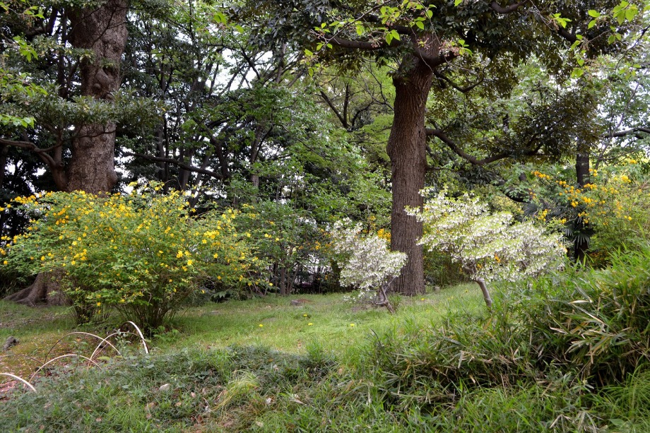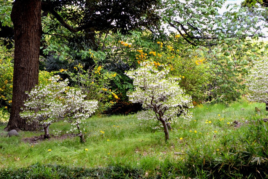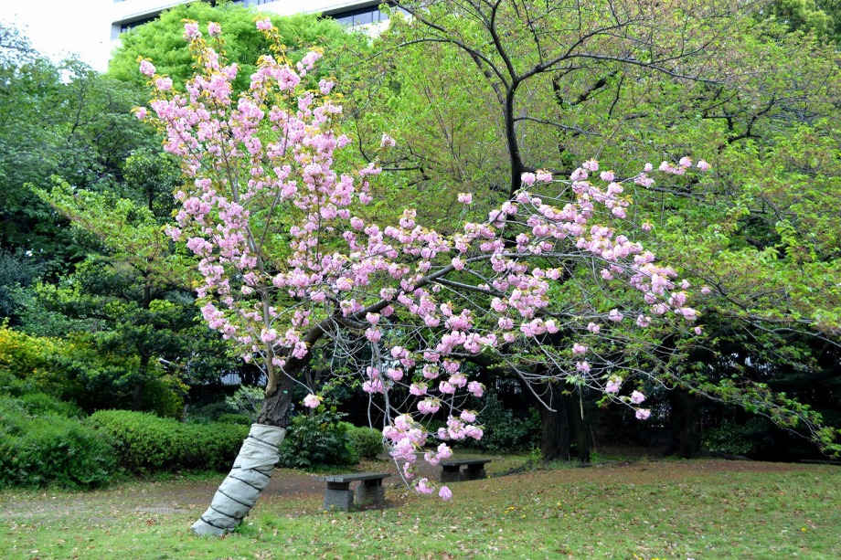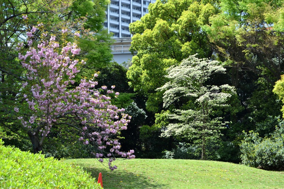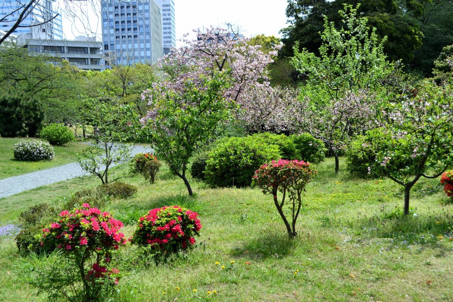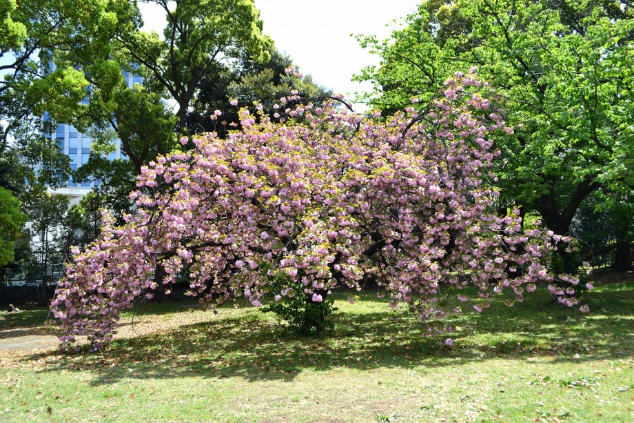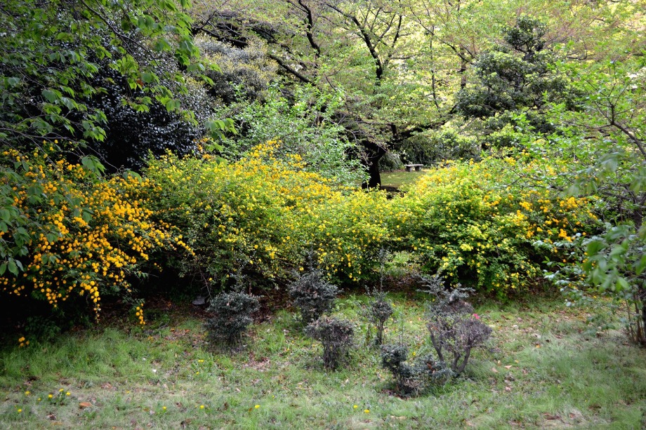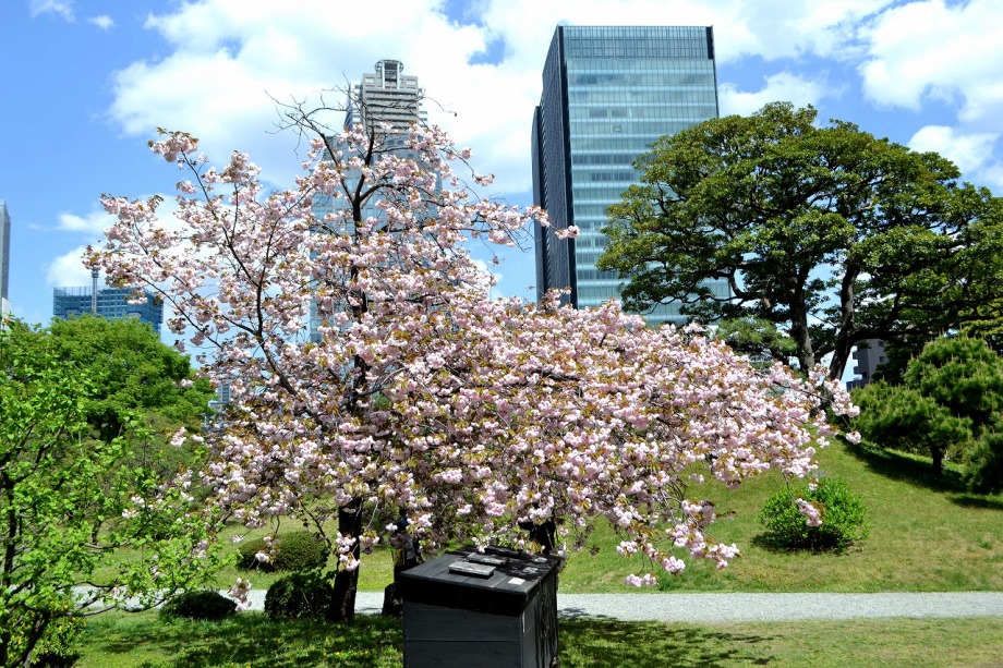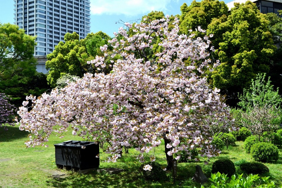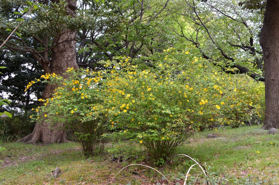 「一言」芝離宮のソメイヨシノは散りましたが、八重桜やボタン桜、御衣黄桜などが満開です。丘のボタンも咲き出しました、 ボタンの奥に植えられているたくさんの山吹が満開で綺麗です。ツツジもあちこちで咲いています。モミジのッ新緑が綺麗です。 むらさきしらんもまとまって咲いています。