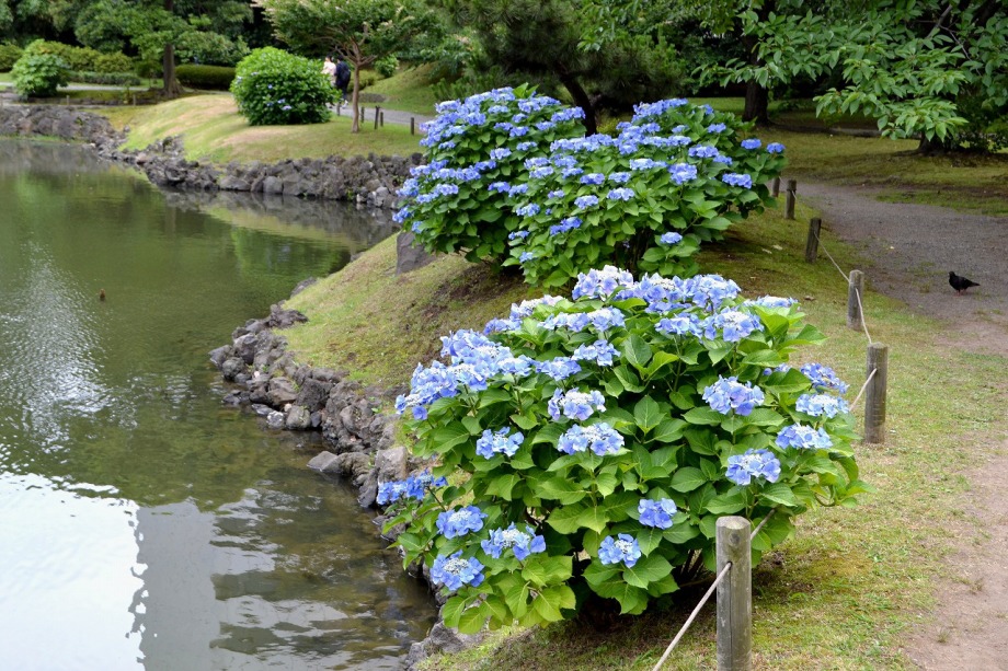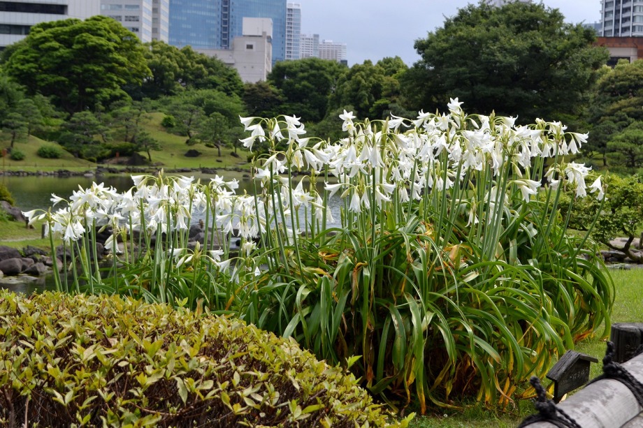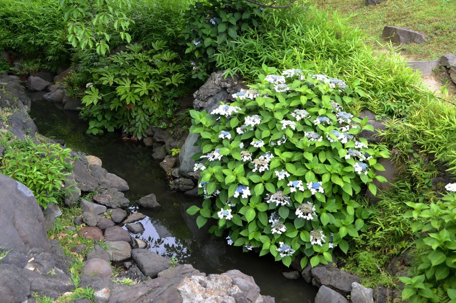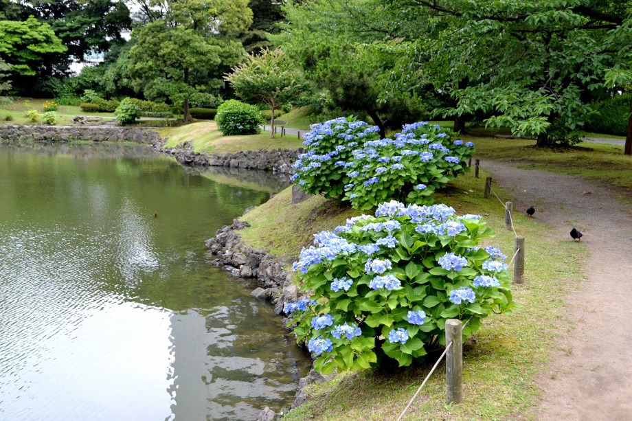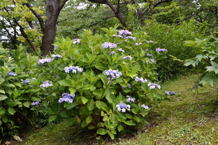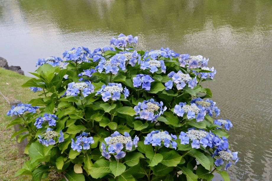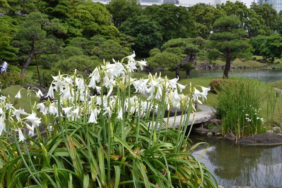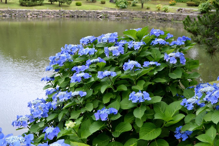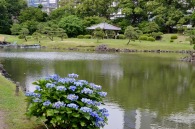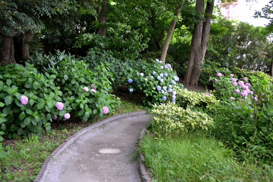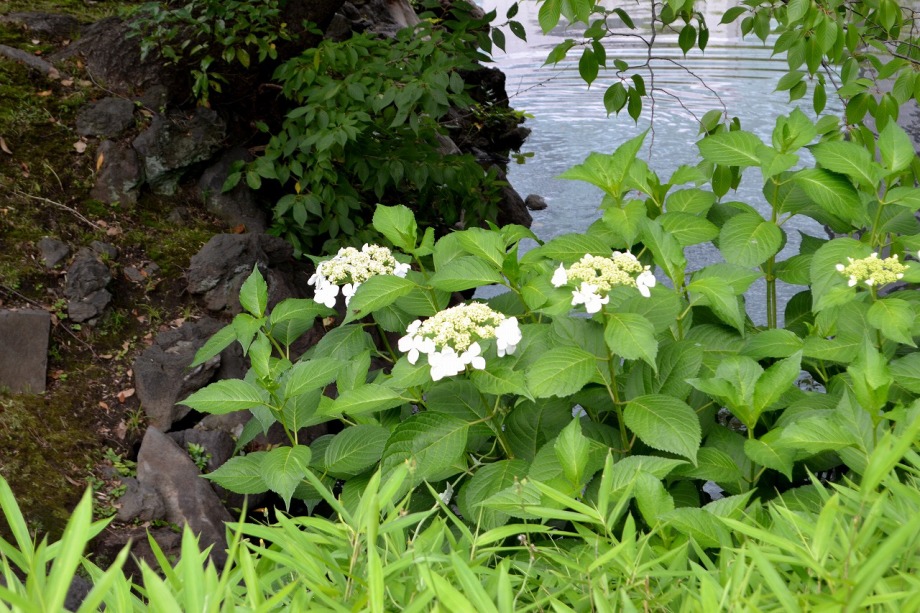 「一言」芝公園のアジサイが見頃になりました。旧芝離宮の入り口には桔梗やホタルフクロが咲いています。真っ白い花のインドハマユウが 満開です。たくさん大きな花が咲くので、庭園を華やかにする感じです。ノカンゾウも咲き出しました。池の周りにアジサイも見頃です。
