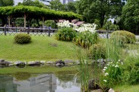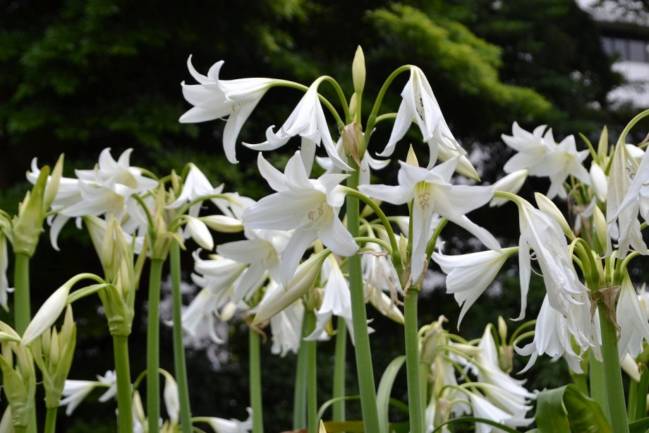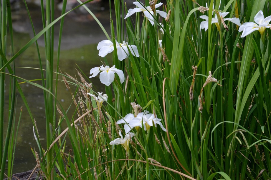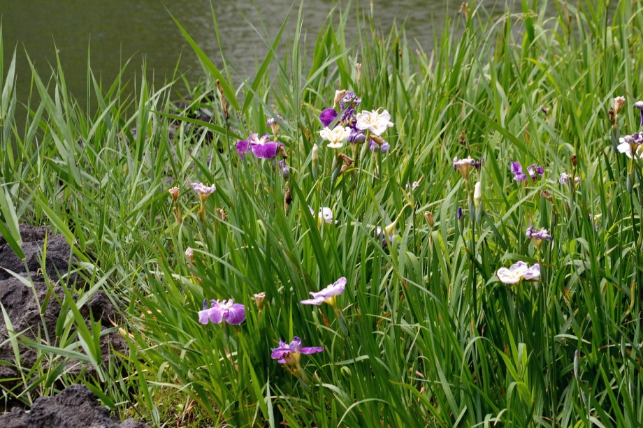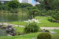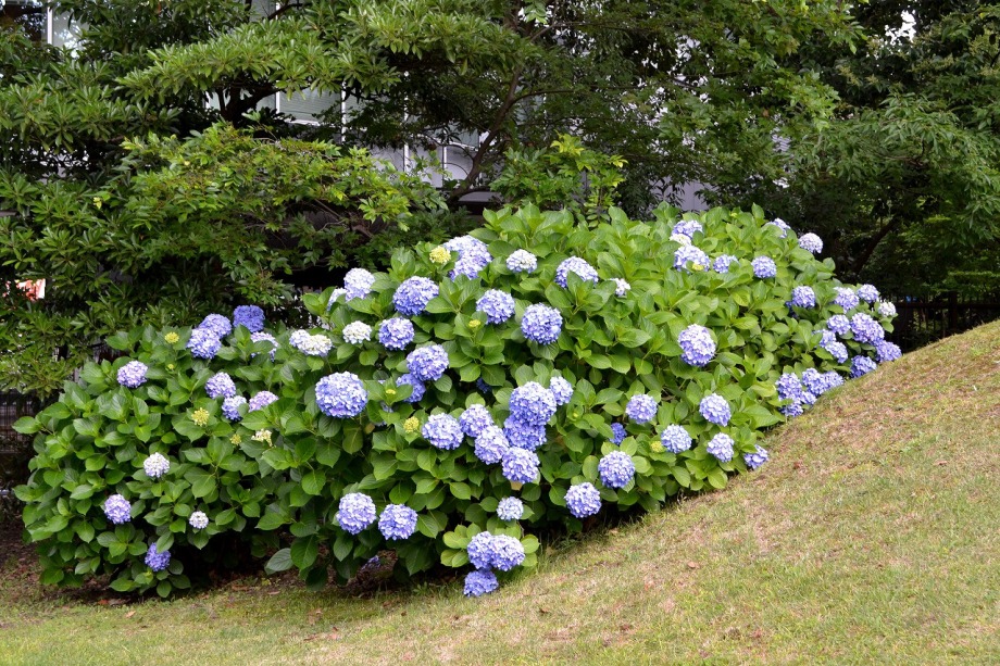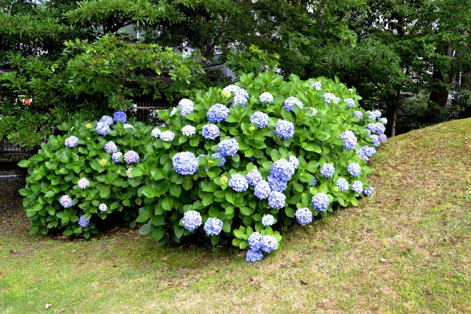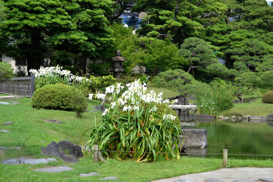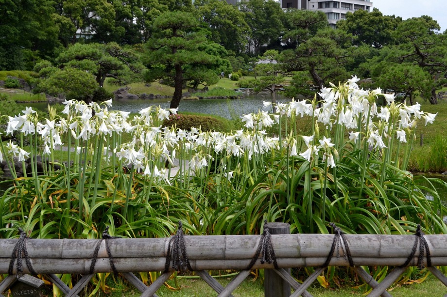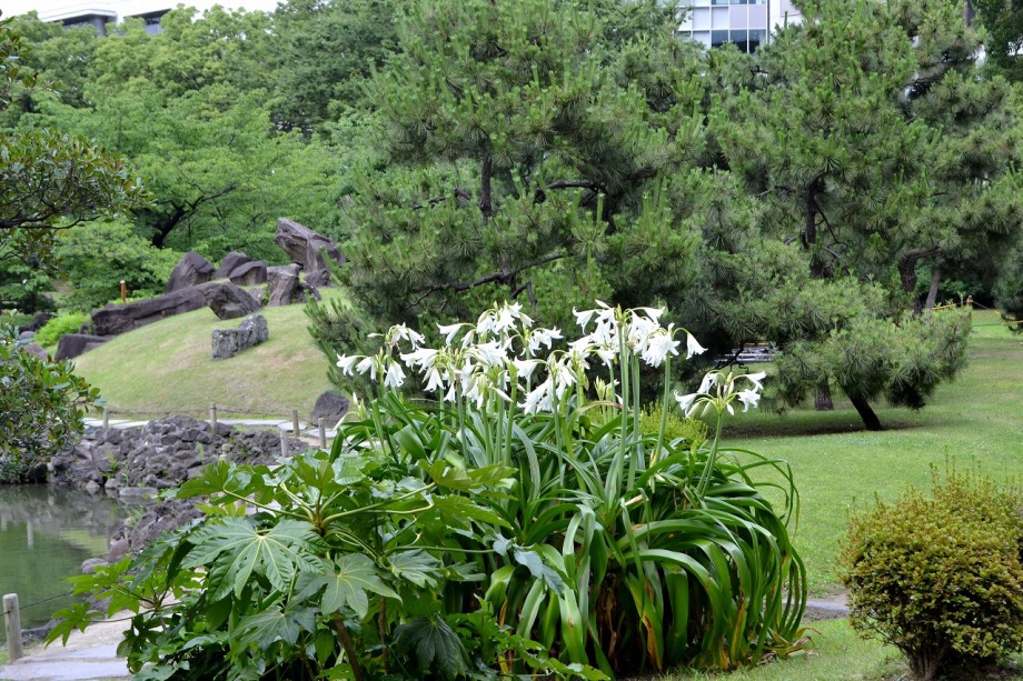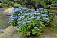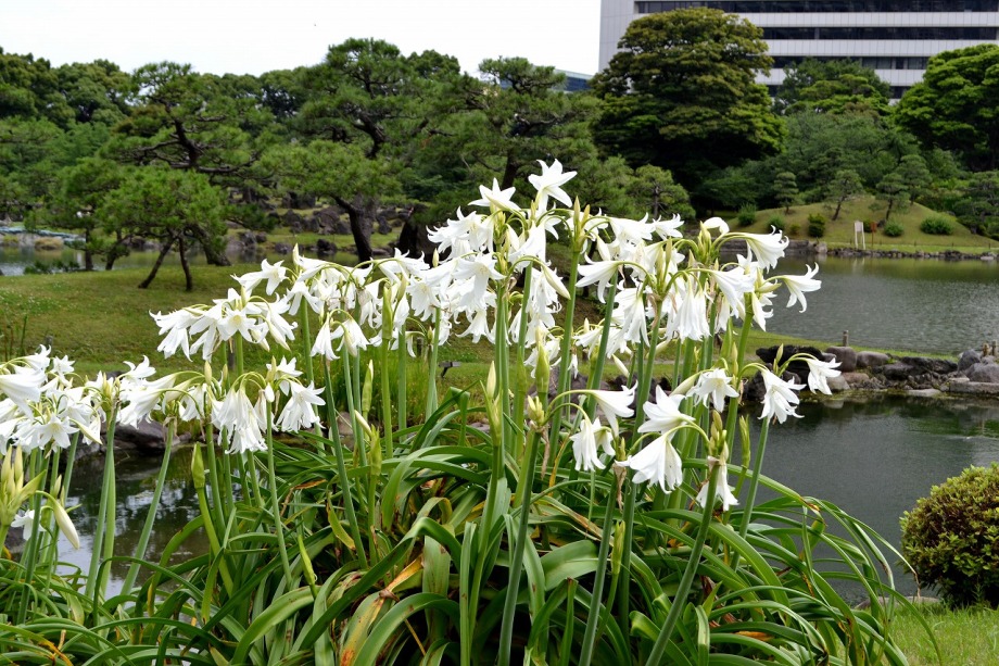 「一言」芝公園のアジサイが見頃になりました。旧芝離宮の入り口には桔梗やホタルフクロが咲いています。真っ白い花のインドハマユウが 満開です。たくさん大きな花が咲くので、庭園を華やかにする感じです。ノカンゾウも咲き出しました。池の周りにアジサイも見頃です。