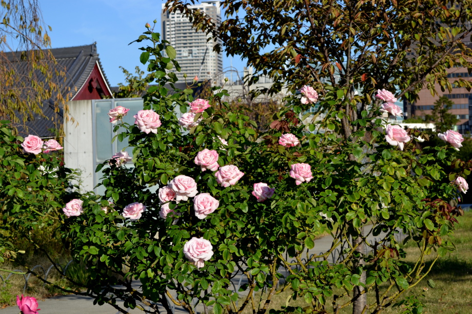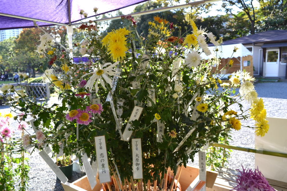 浜松町の芝離宮に菊を見に行った。百種接分菊という珍しい菊があると言うことで見に行った。趣向としては面白いが、 菊には接ぎ木した菊の名前がぶら下がって、菊は良く見えなかった。盆栽の菊が面白かった。帰りにプリンスホテルで バラの写真を撮った。