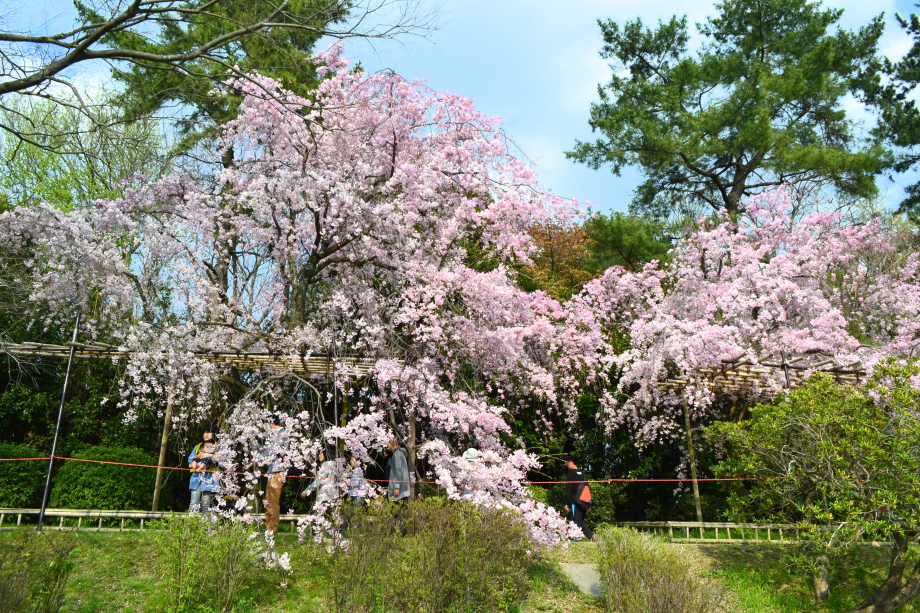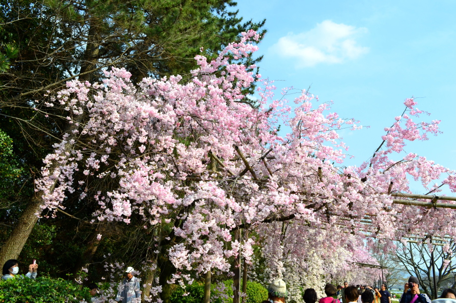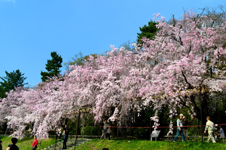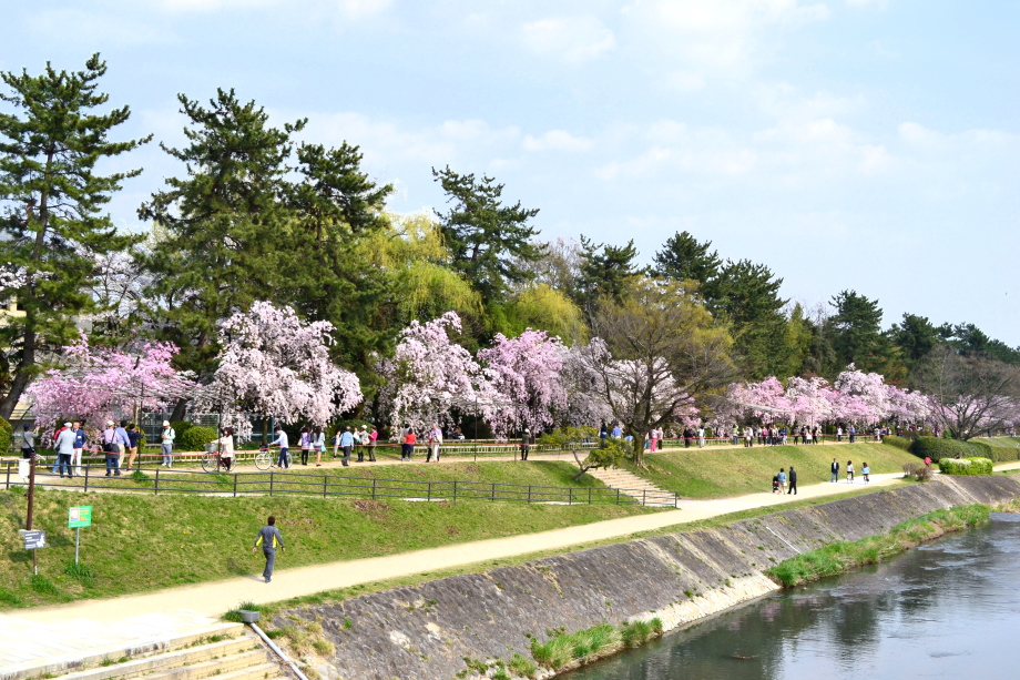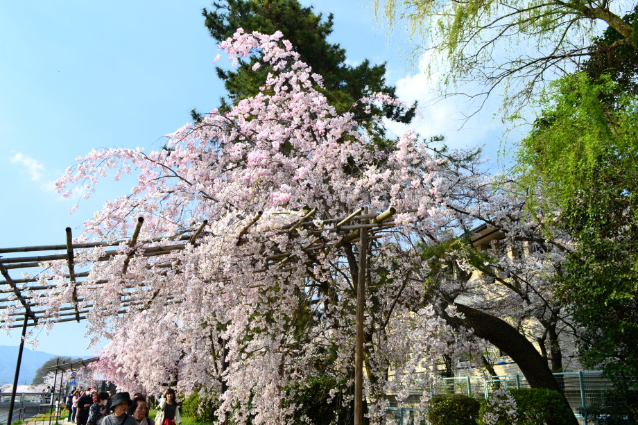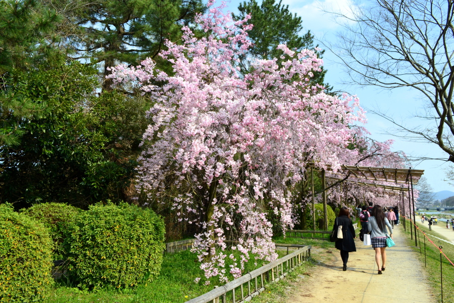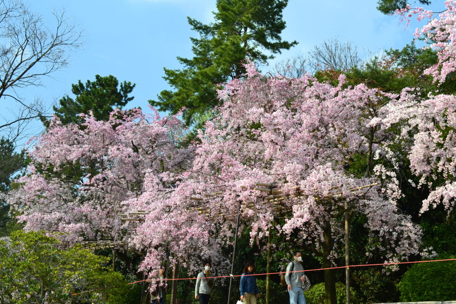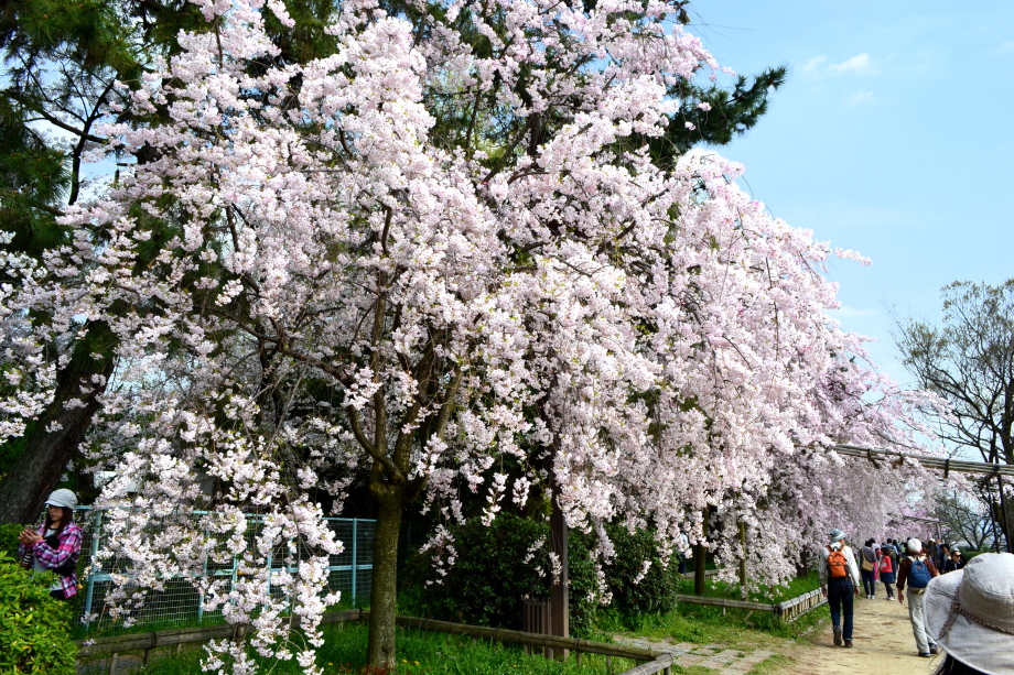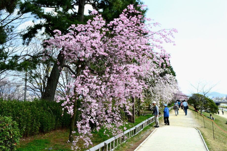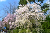 「感想」 京都植物園を見た後、半木の道の桜を見に行った。しだれ桜の花が満開の状況で、道沿いの桜は綺麗だった。