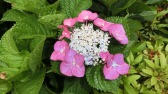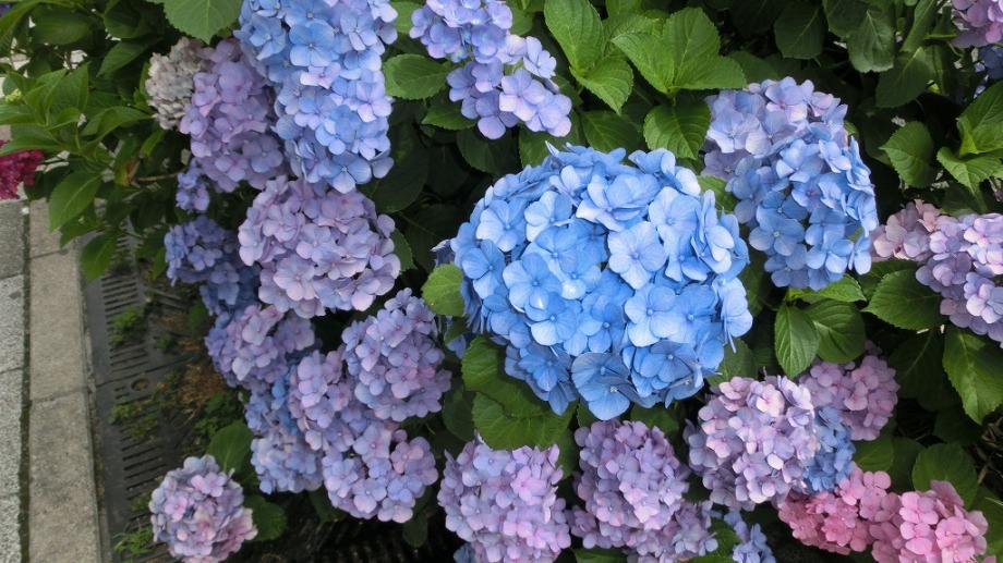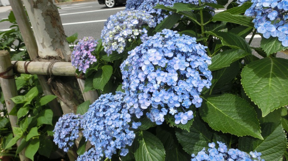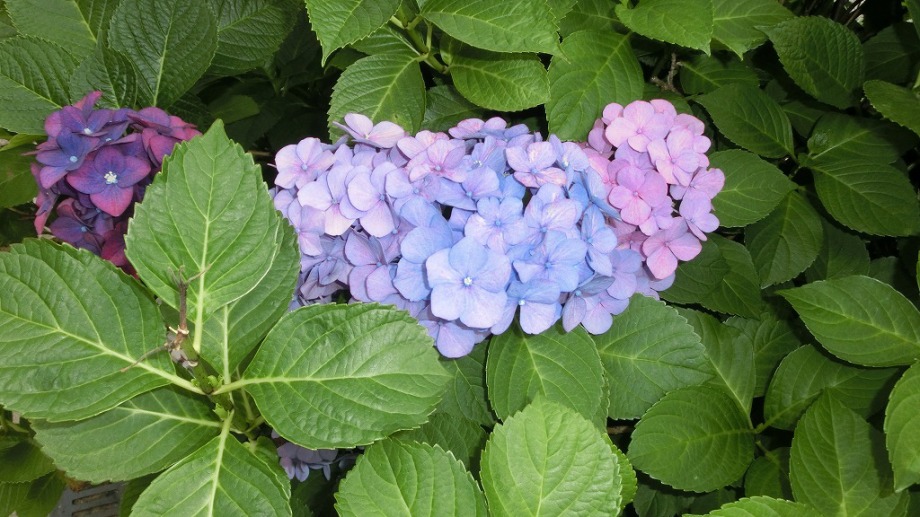 「一言」三田地域に色々な種類の紫陽花が咲いています。春日神社の前には早くから色々な色の花をつける