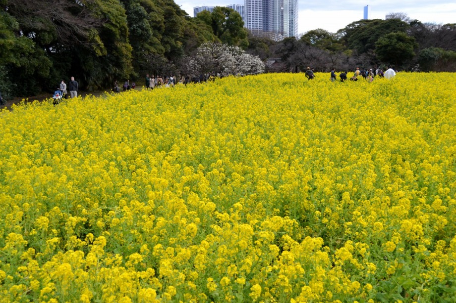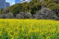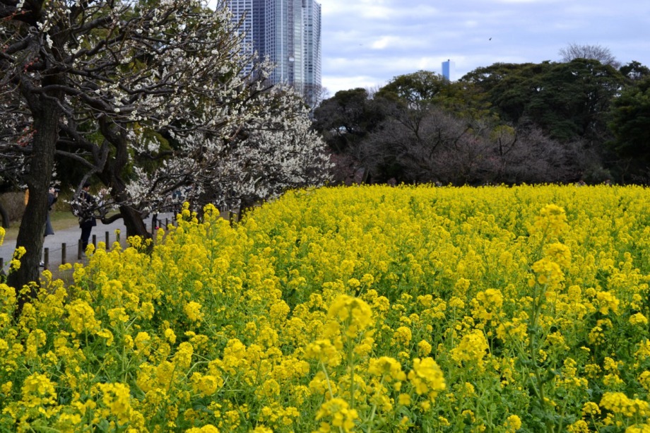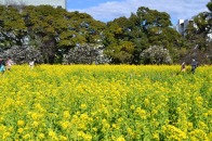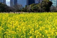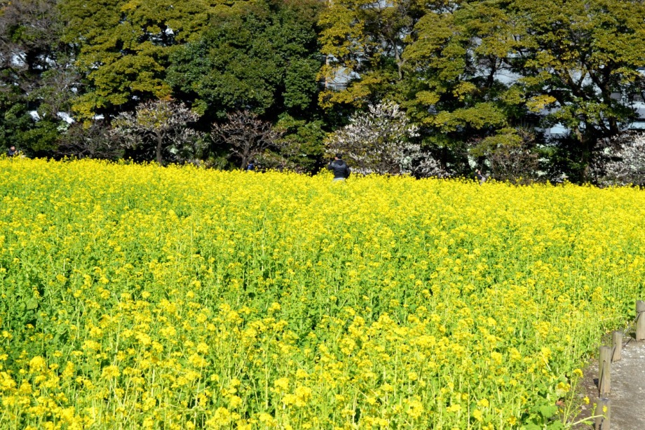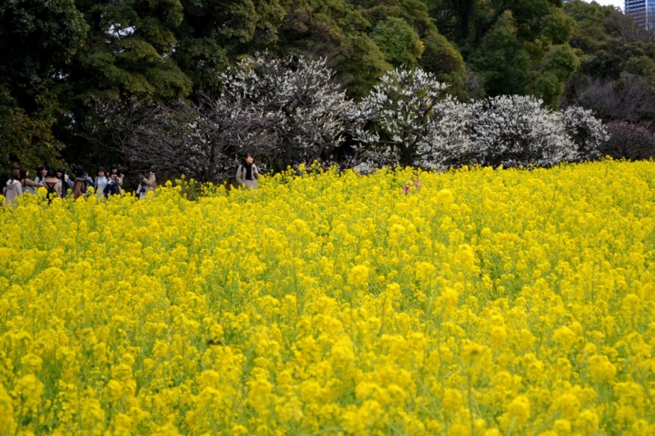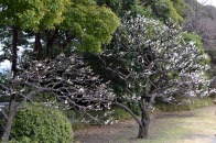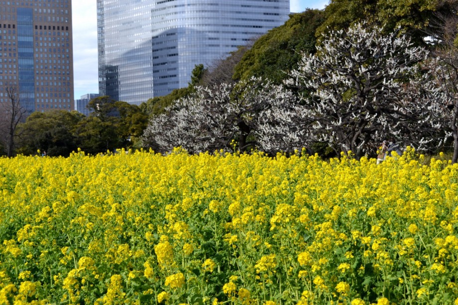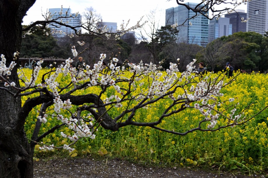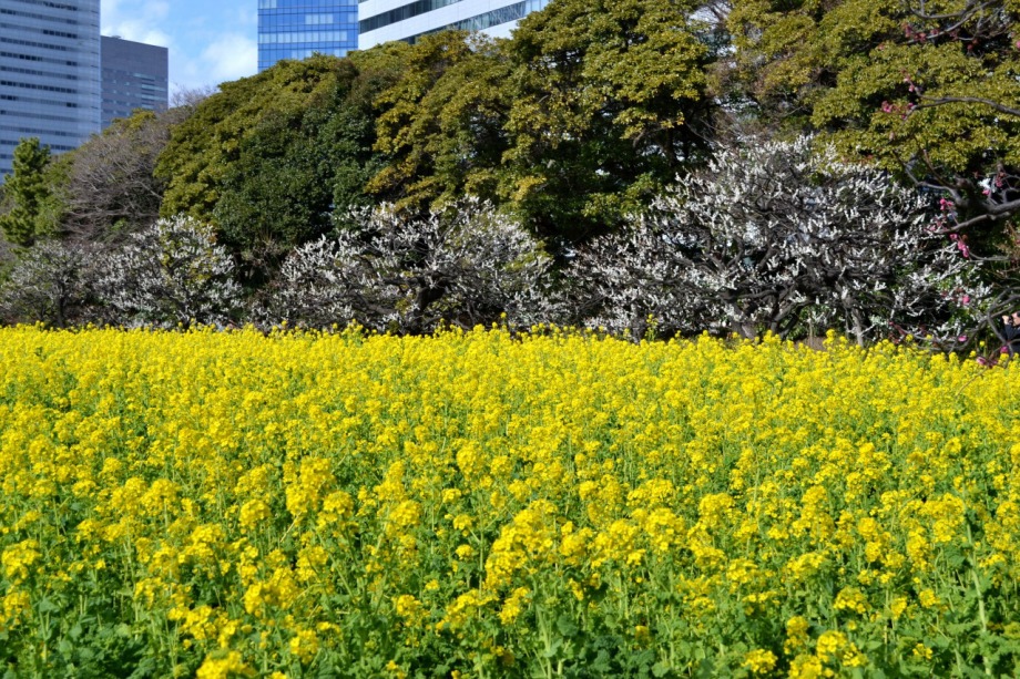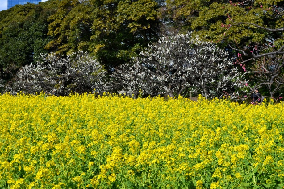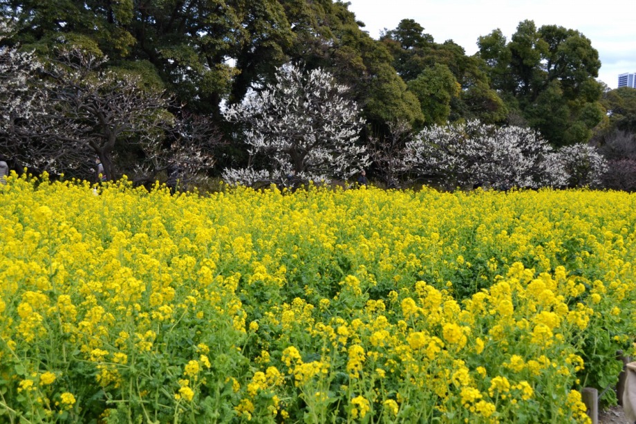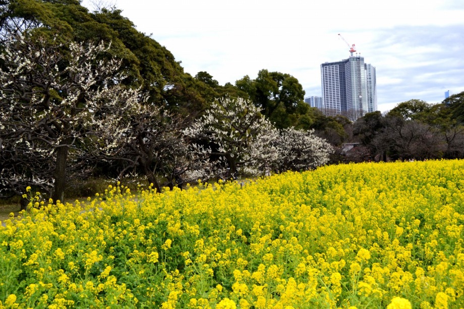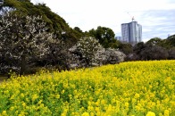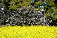 「感想」今日は午後から天気が回復するというので、浜離宮の梅の花を見に行きました。入り口を入ると菜の花の黄色の絨毯が見え、 その横には、白梅が花をつけていました。奥の梅林には白梅が見頃でした。紅梅はもう少しという感じで、つぼみが大きくなって いました。白梅と紅梅が一本の木に咲くという思いのままも数多く咲いていました。