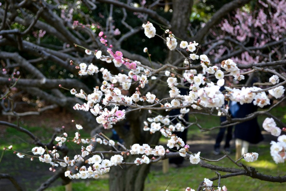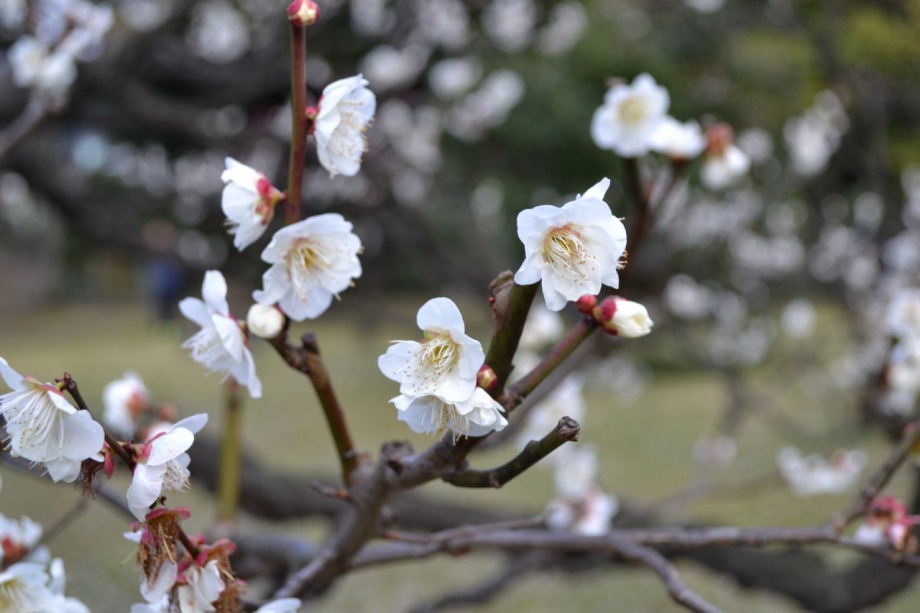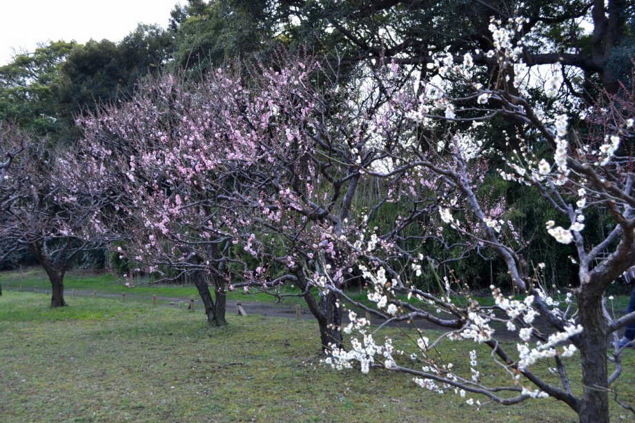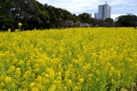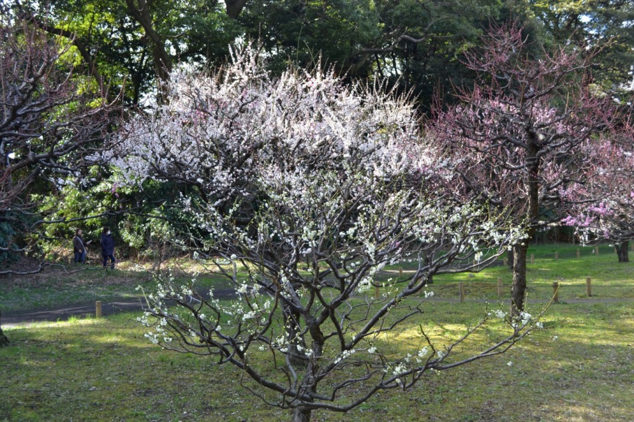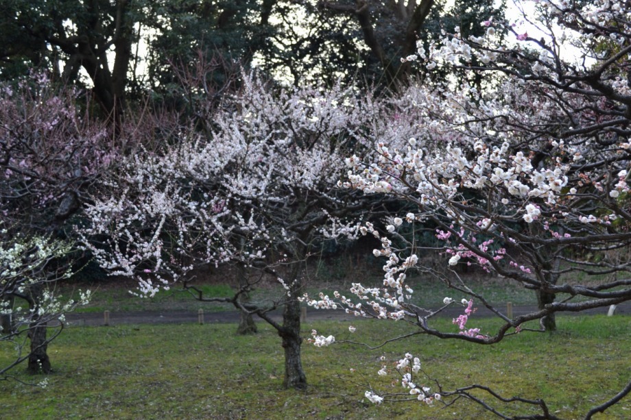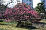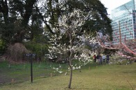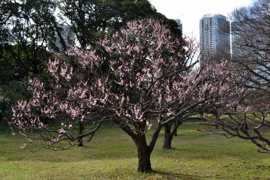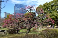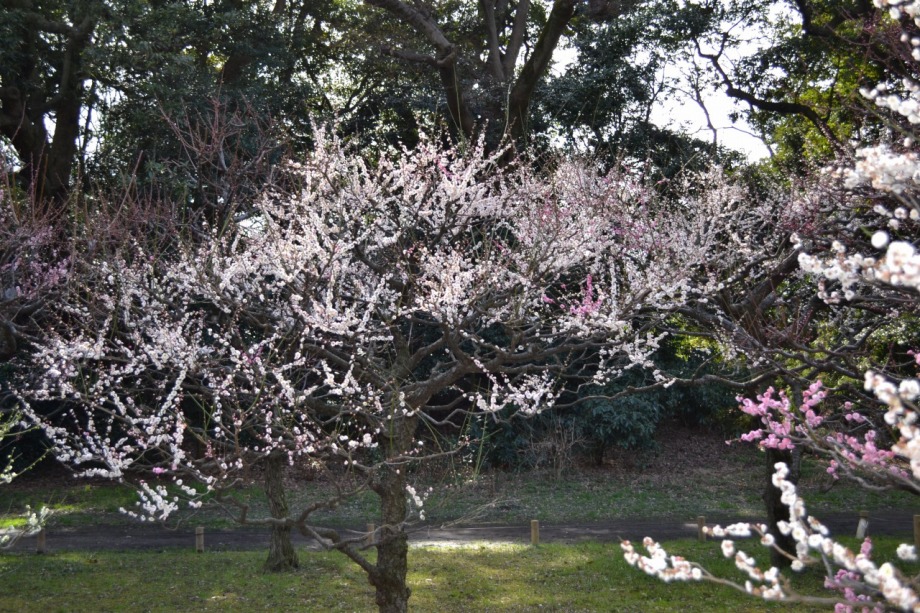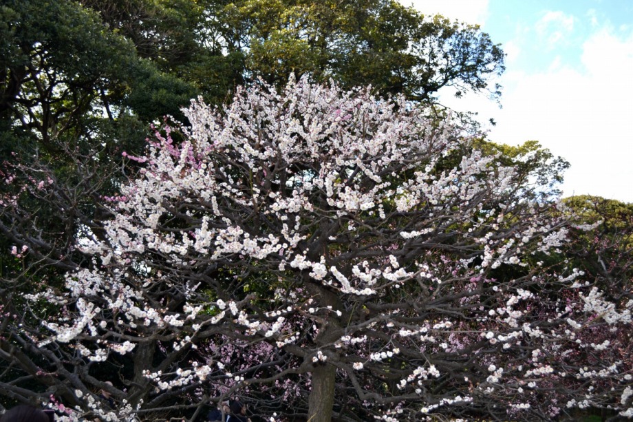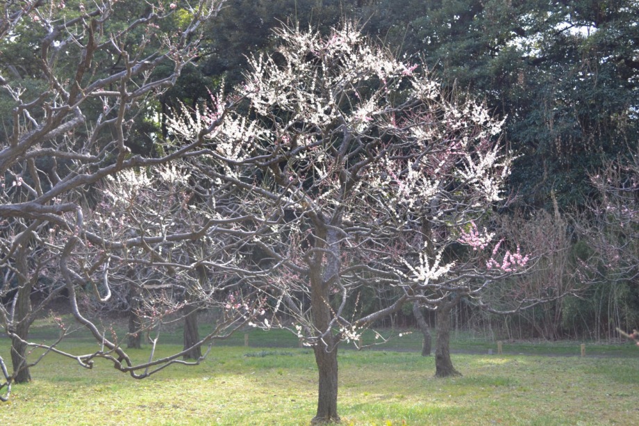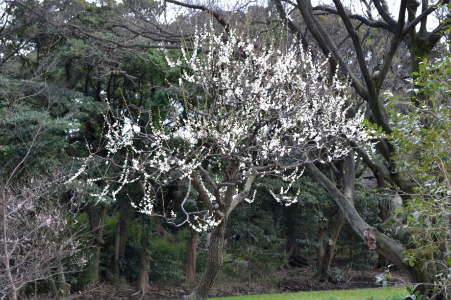 「感想」今日は午後から天気が回復するというので、浜離宮の梅の花を見に行きました。入り口を入ると菜の花の黄色の絨毯が見え、 その横には、白梅が花をつけていました。奥の梅林には白梅が見頃でした。紅梅はもう少しという感じで、つぼみが大きくなって いました。白梅と紅梅が一本の木に咲くという思いのままも数多く咲いていました。