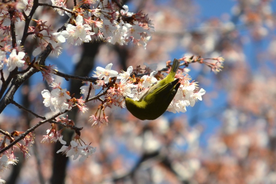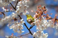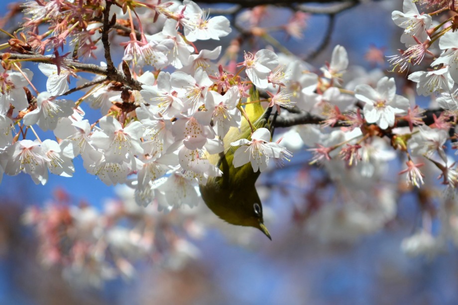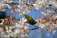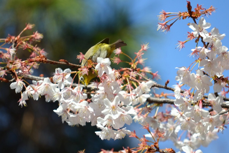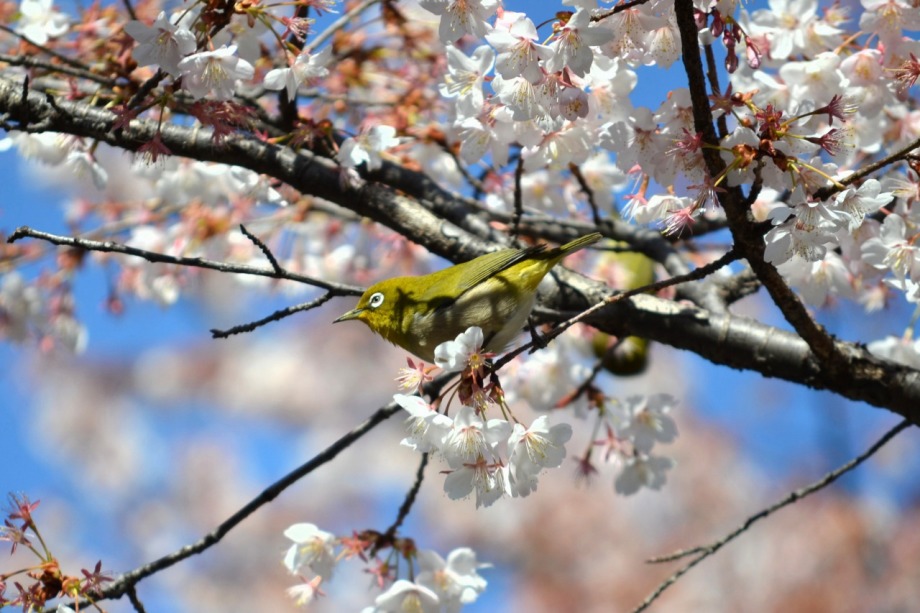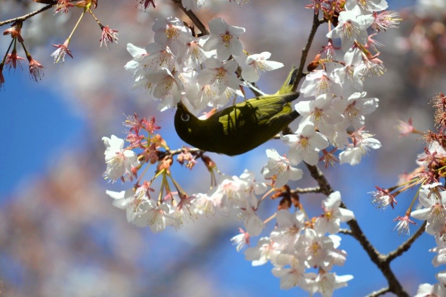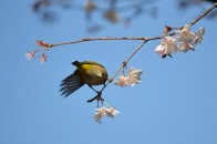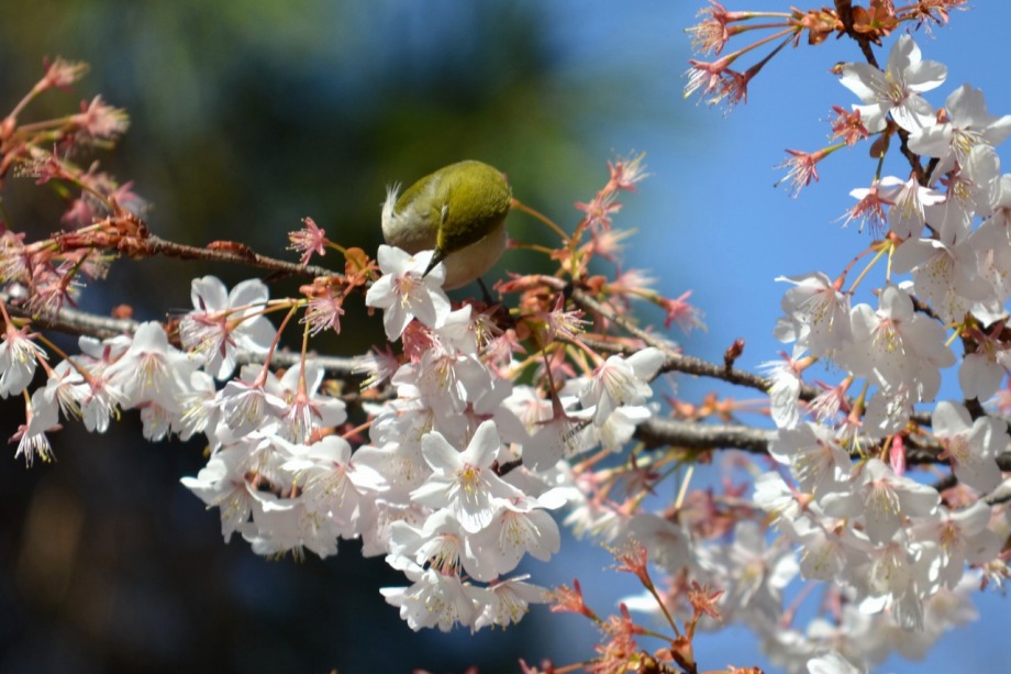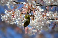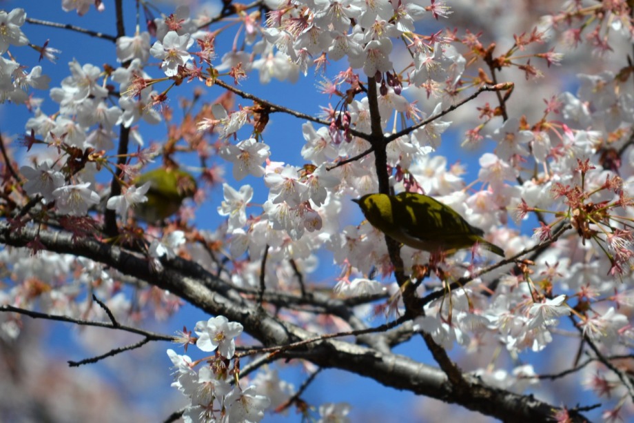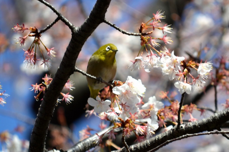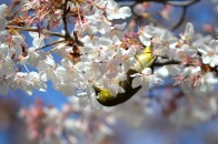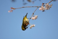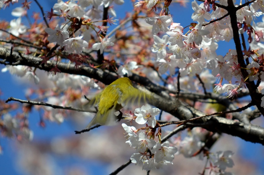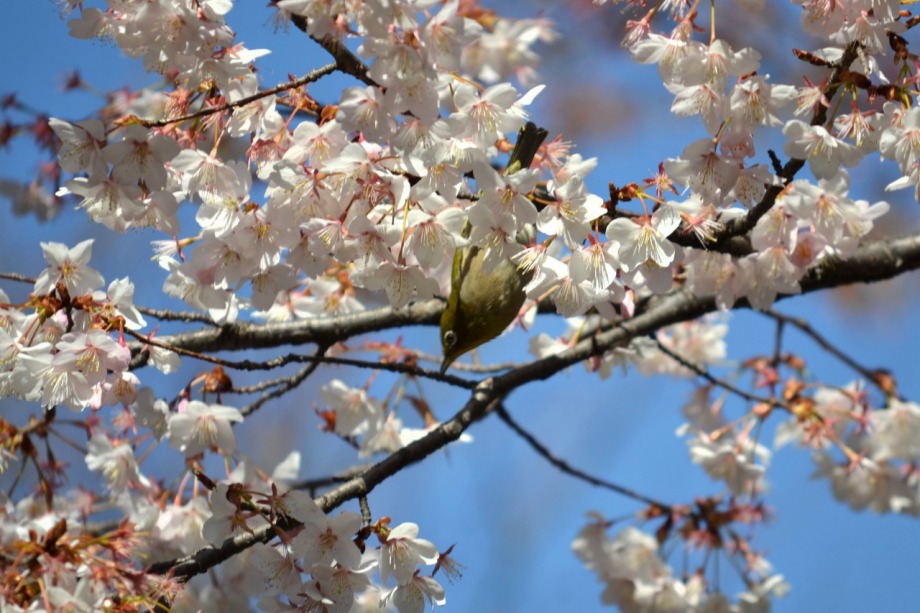 「一言」三田4丁目の実相寺に咲いている大きな早咲きの桜の木にメジロがたくさん集まっています。早咲きの桜?は既に 散り始めていますが、たくさん集まっているメジロの写真を撮りました。メジロの動きがはやくなかなか上手く撮れません でしたが、面白い写真が撮れたものを集めました。桜の花を啄むメジロを見ていると春が来た感じがします。