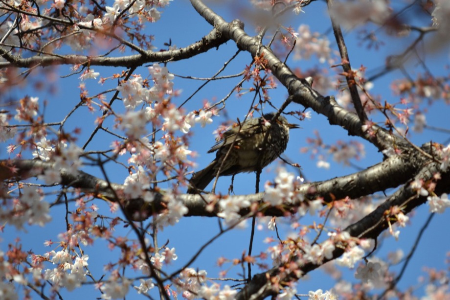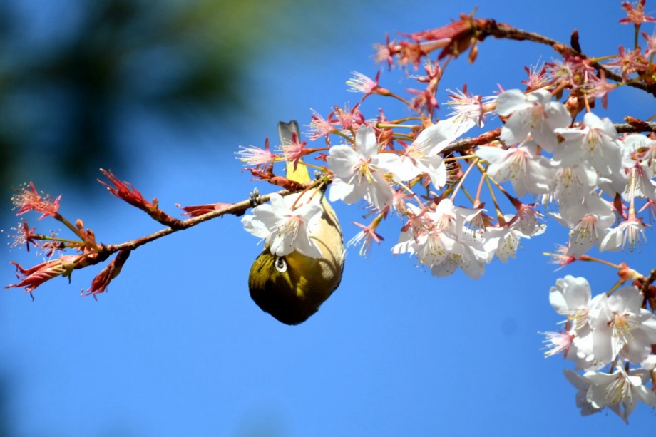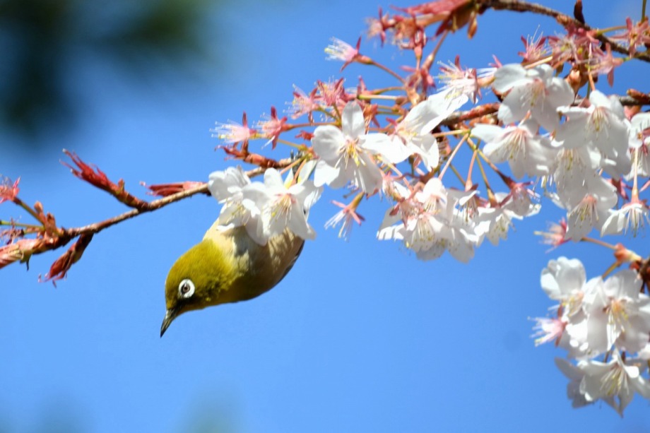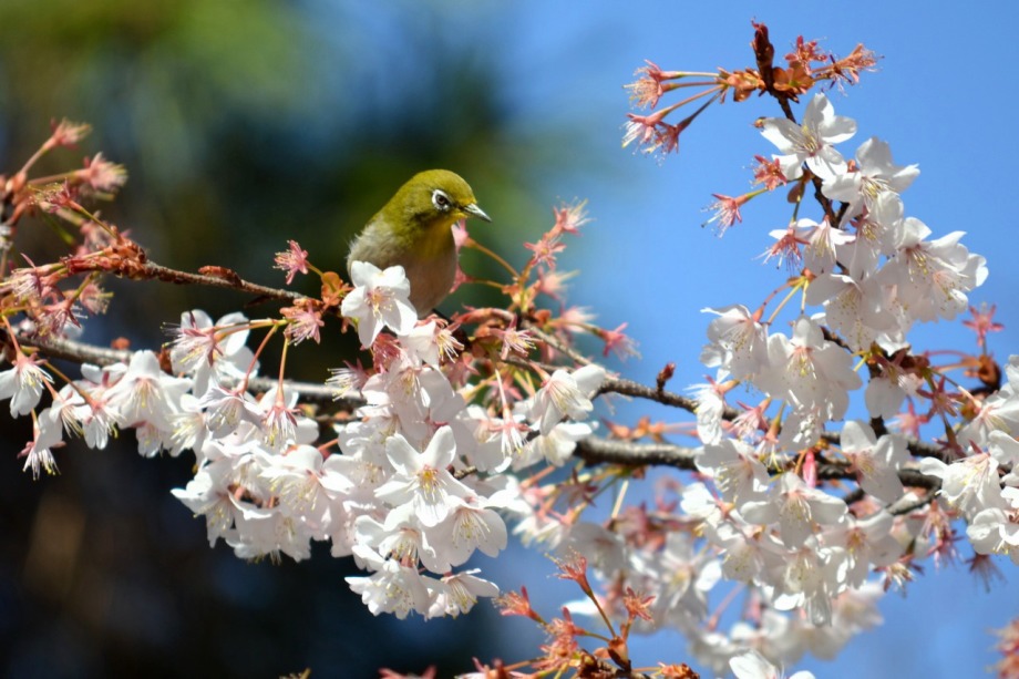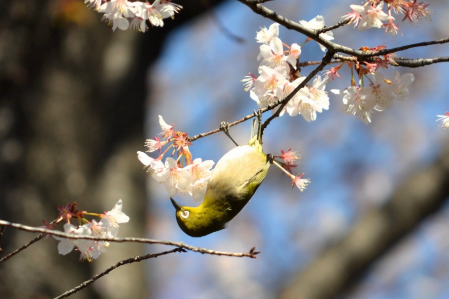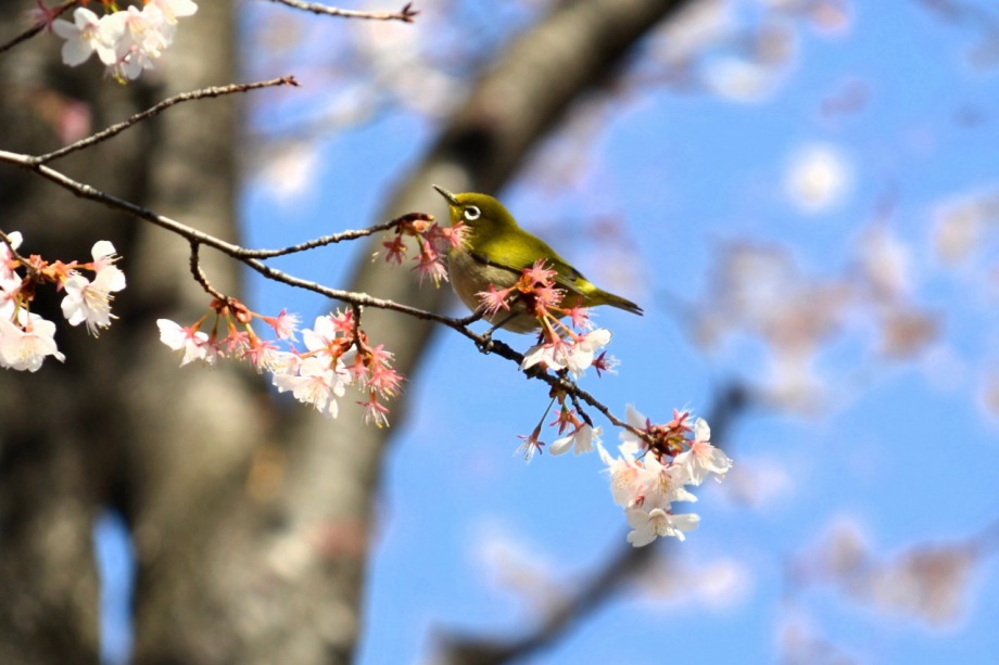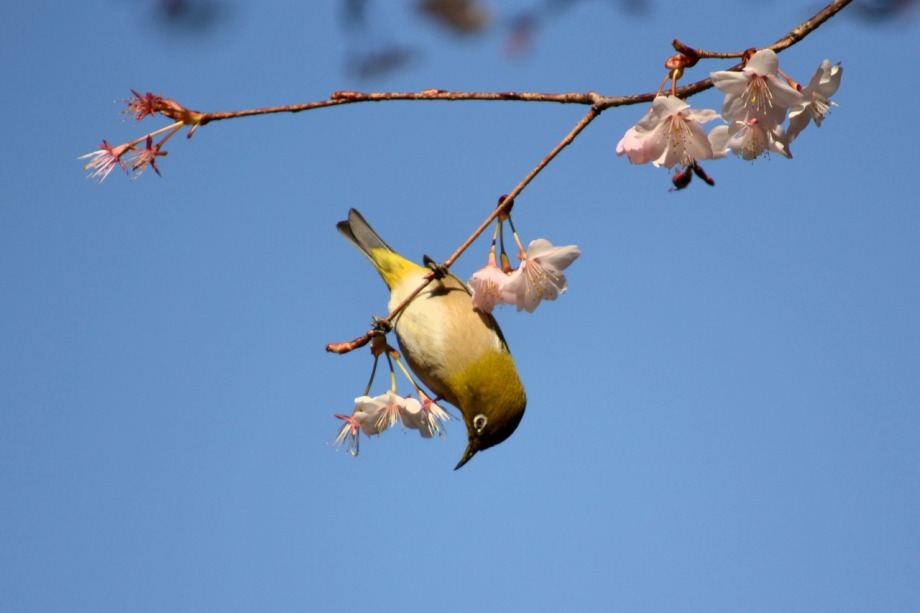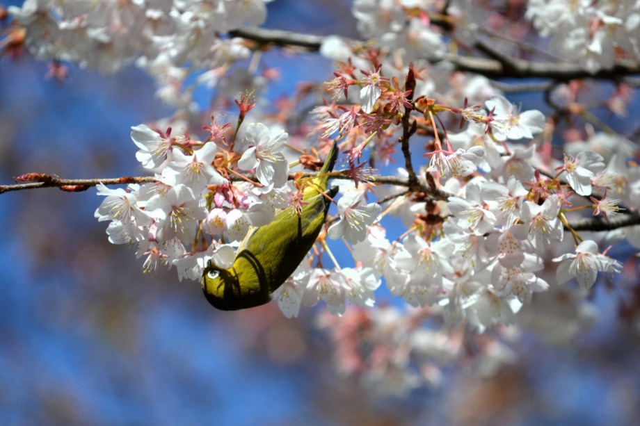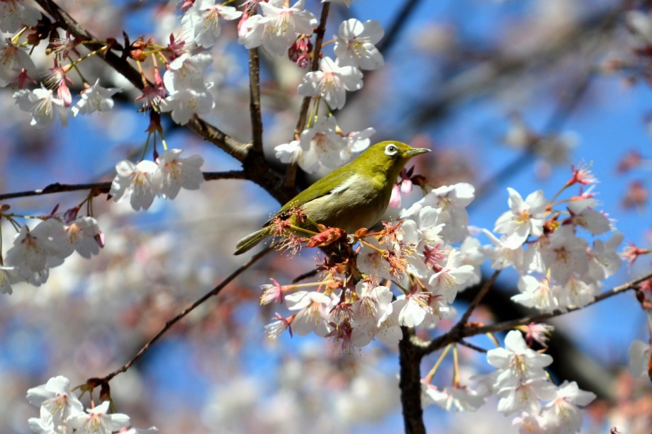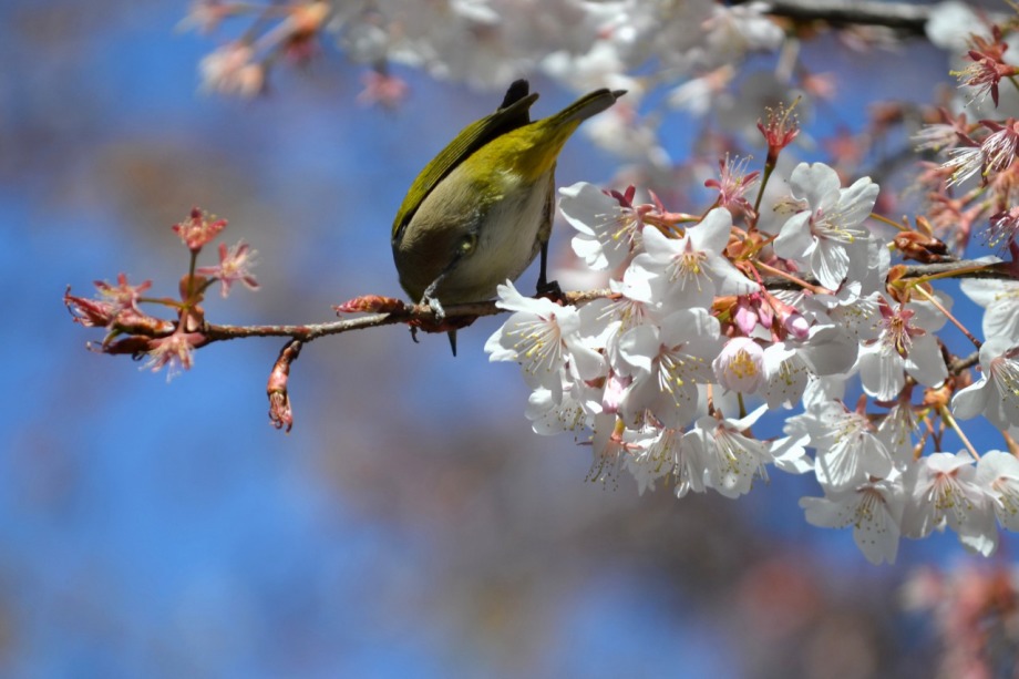 「一言」三田4丁目の実相寺に咲いている大きな早咲きの桜の木にメジロがたくさん集まっています。早咲きの桜?は既に 散り始めていますが、たくさん集まっているメジロの写真を撮りました。メジロの動きがはやくなかなか上手く撮れません でしたが、面白い写真が撮れたものを集めました。桜の花を啄むメジロを見ていると春が来た感じがします。