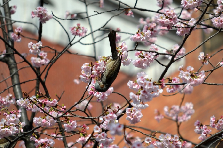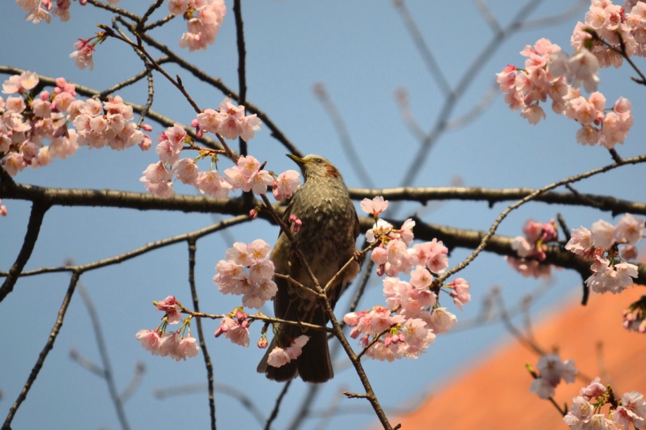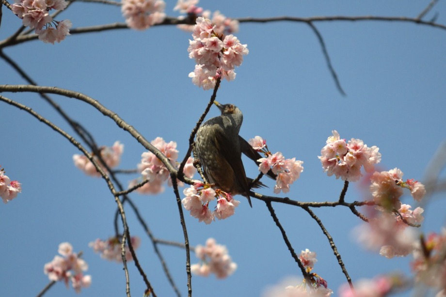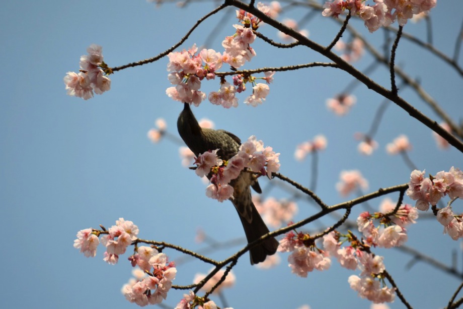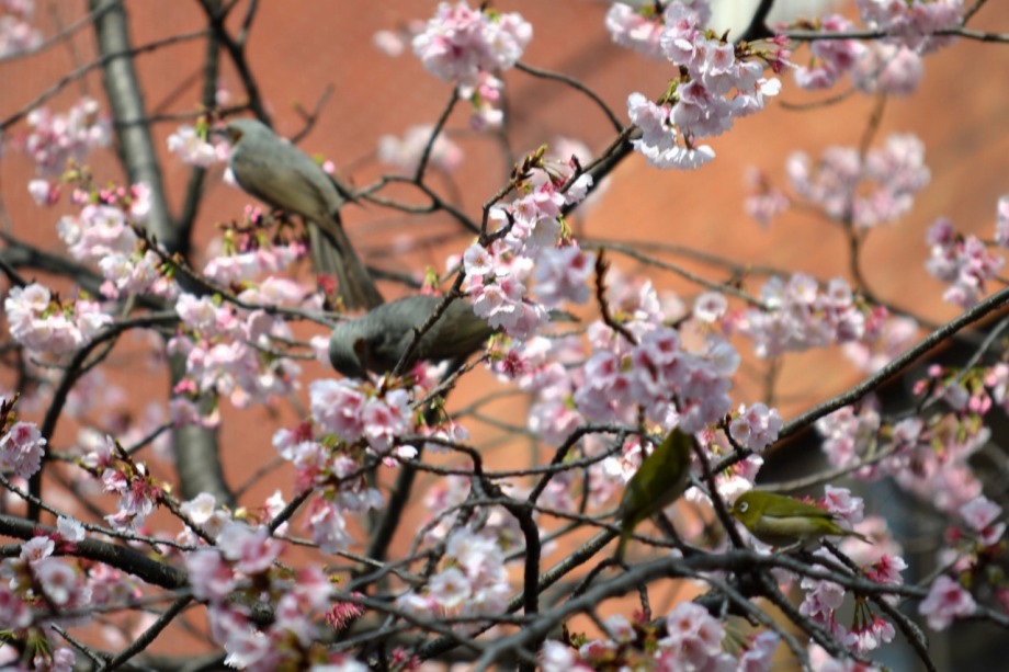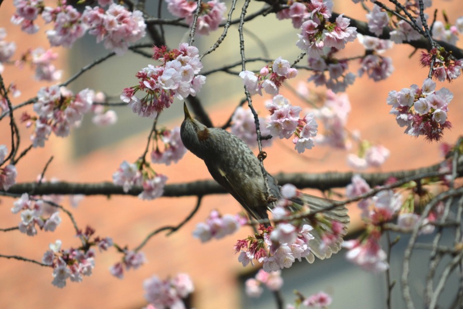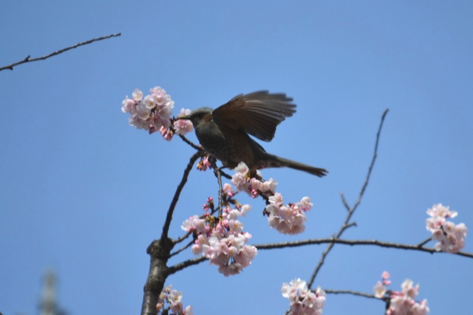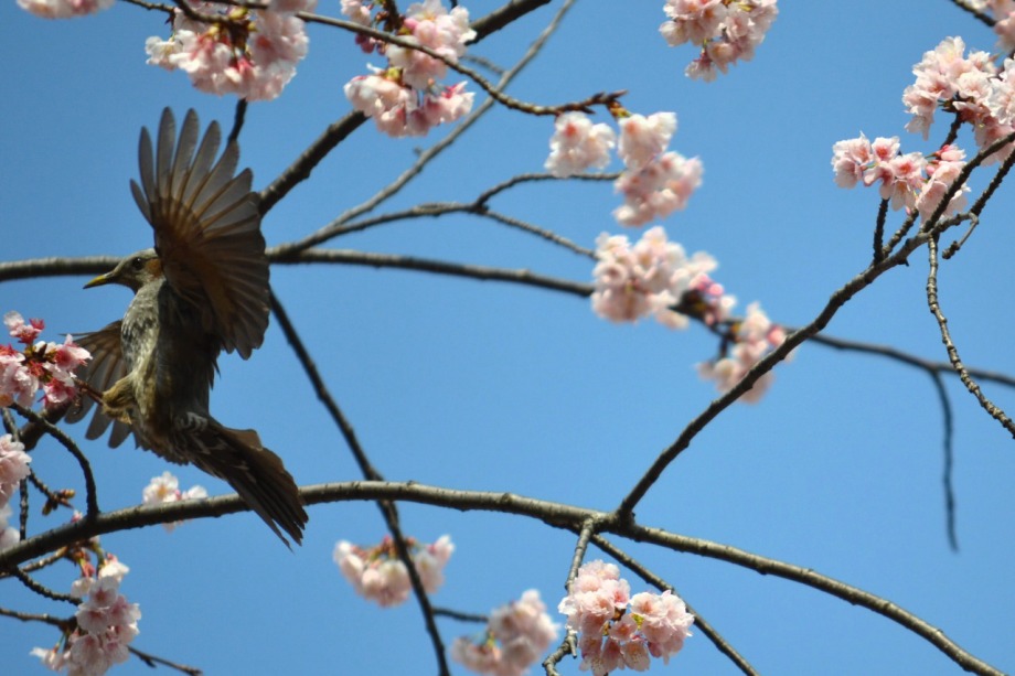 「一言」慶応大学の東門を入ったところに早咲きの桜が咲いていますが、桜の花をついばみにたくさんの鳥がきています。 こちらはヒヨドリと思われる大きな鳥が多いので、じっくりと鳥の写真を撮りました。色々な動きをして面白かった。 早咲きの桜はそろそろ散り始めていました。