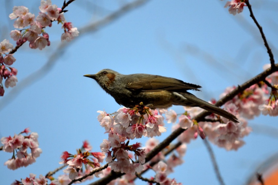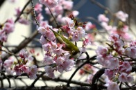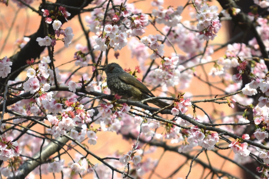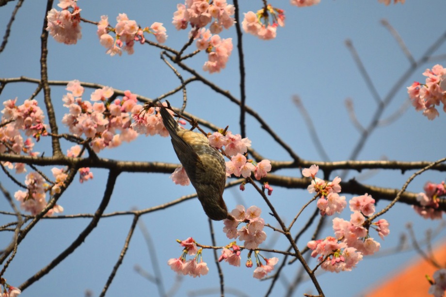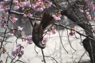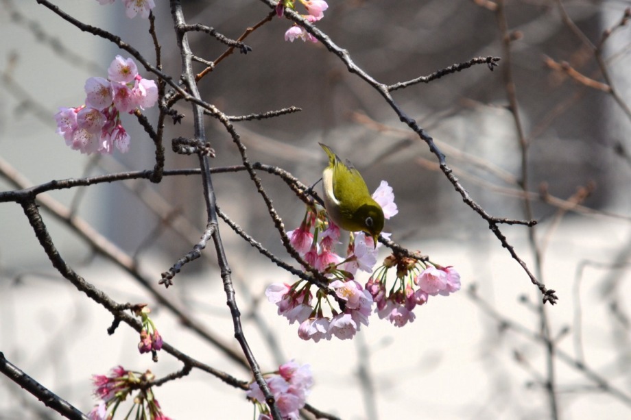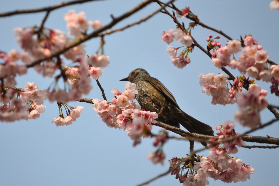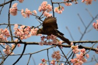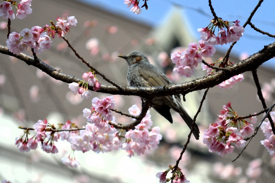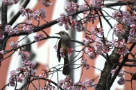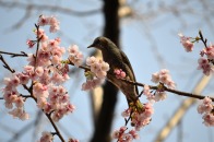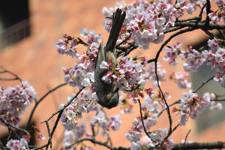 「一言」慶応大学の東門を入ったところに早咲きの桜が咲いていますが、桜の花をついばみにたくさんの鳥がきています。 こちらはヒヨドリと思われる大きな鳥が多いので、じっくりと鳥の写真を撮りました。色々な動きをして面白かった。 早咲きの桜はそろそろ散り始めていました。