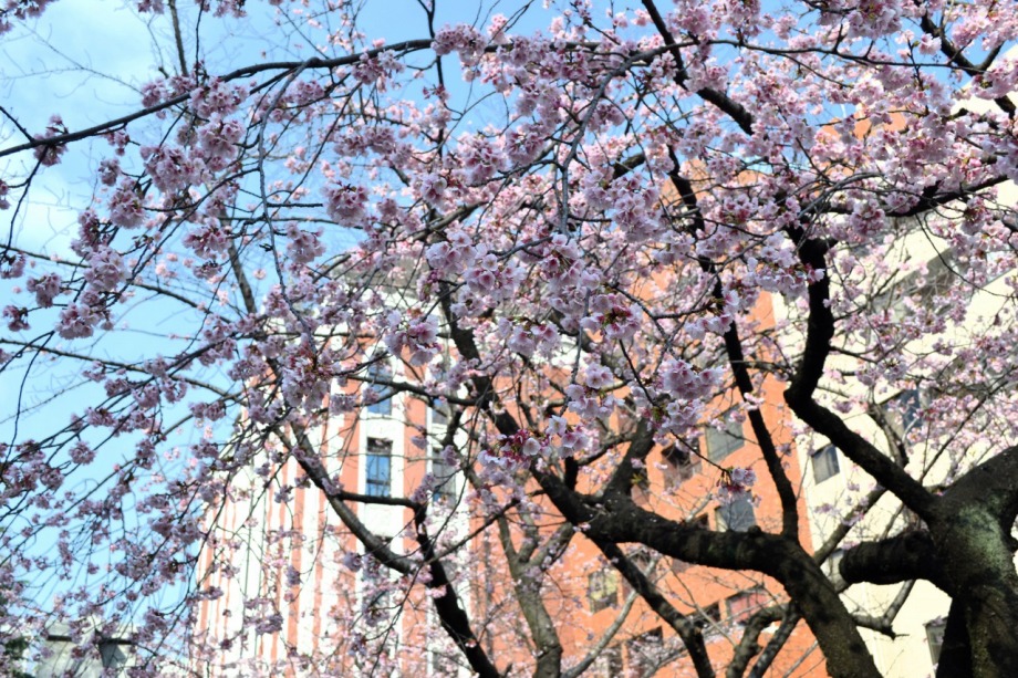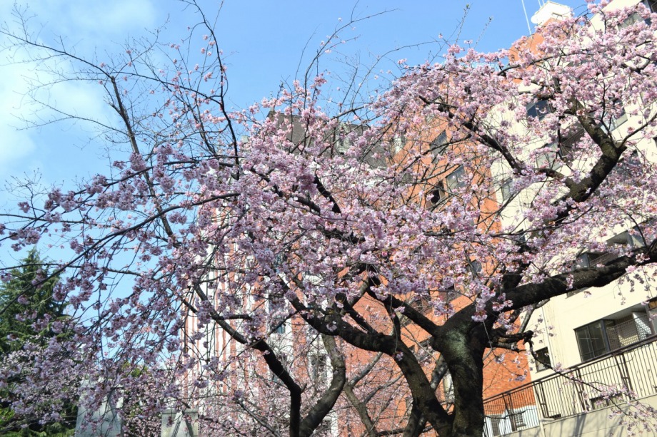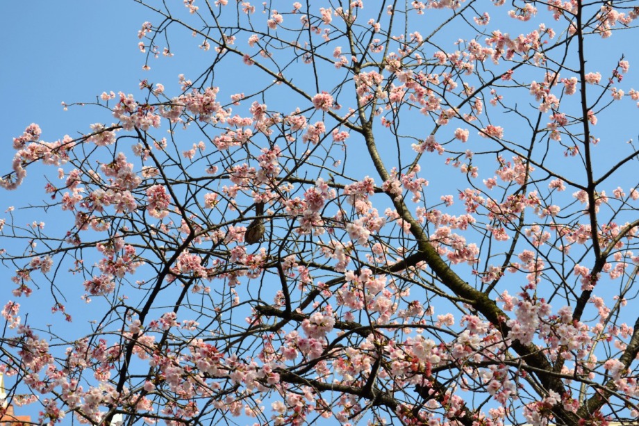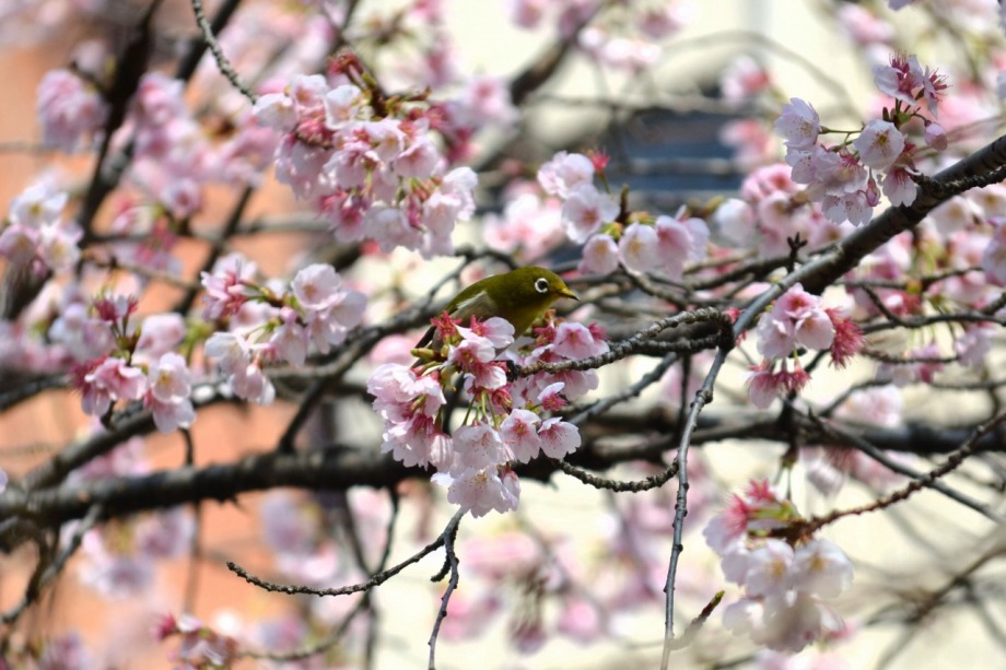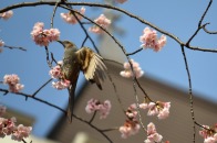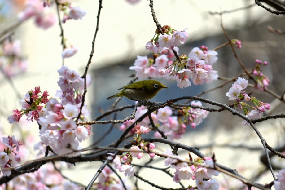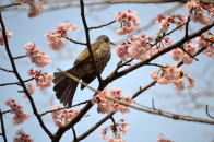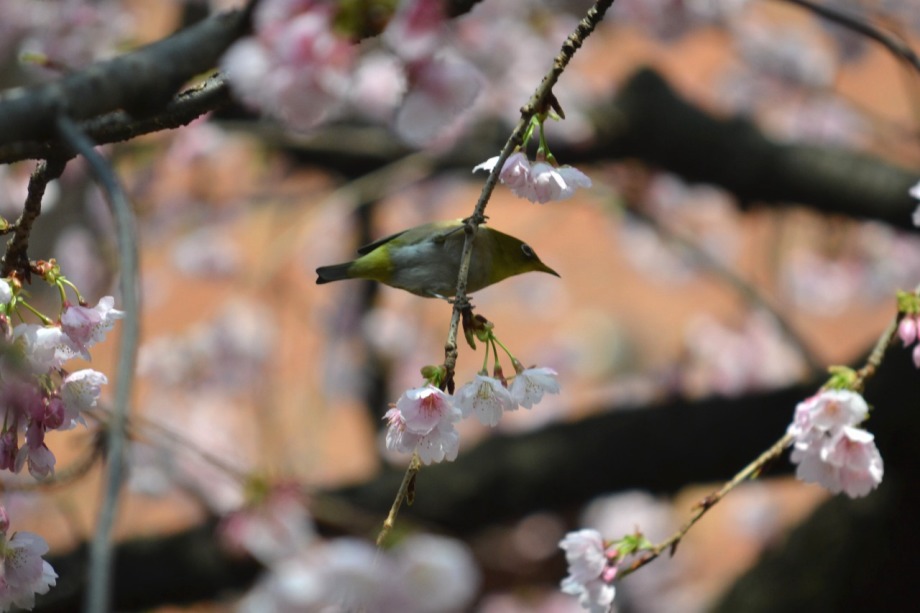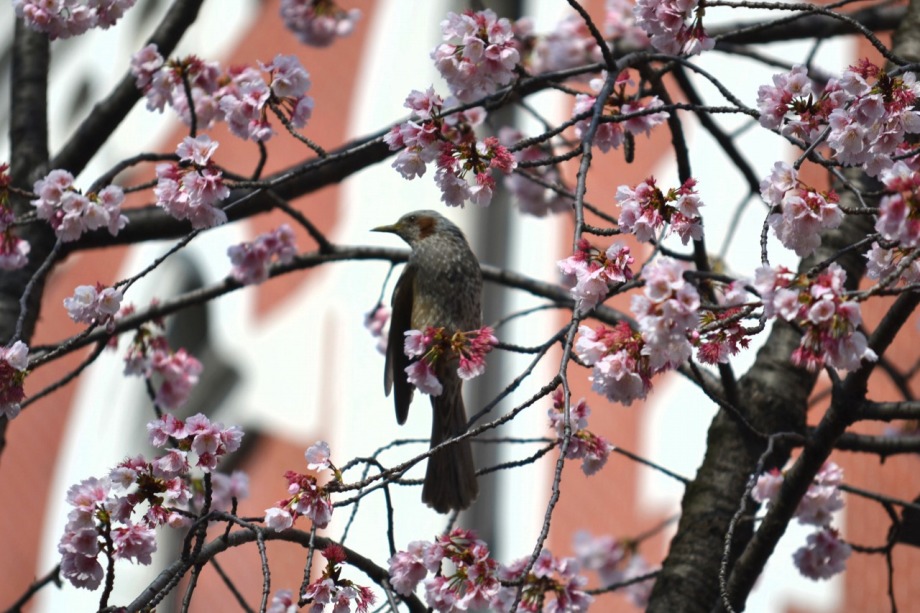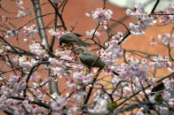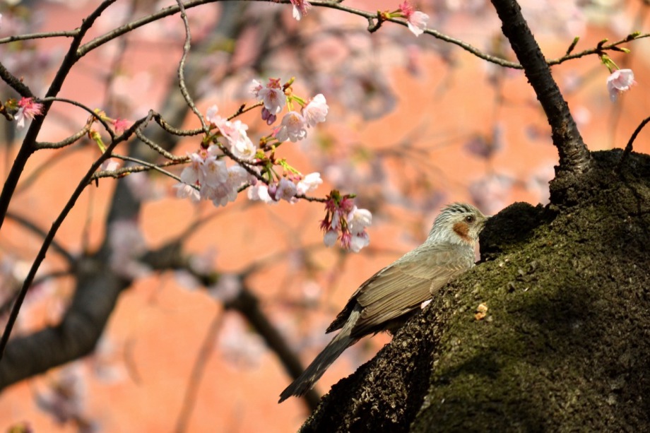 「一言」慶応大学の東門を入ったところに早咲きの桜が咲いていますが、桜の花をついばみにたくさんの鳥がきています。 こちらはヒヨドリと思われる大きな鳥が多いので、じっくりと鳥の写真を撮りました。色々な動きをして面白かった。 早咲きの桜はそろそろ散り始めていました。