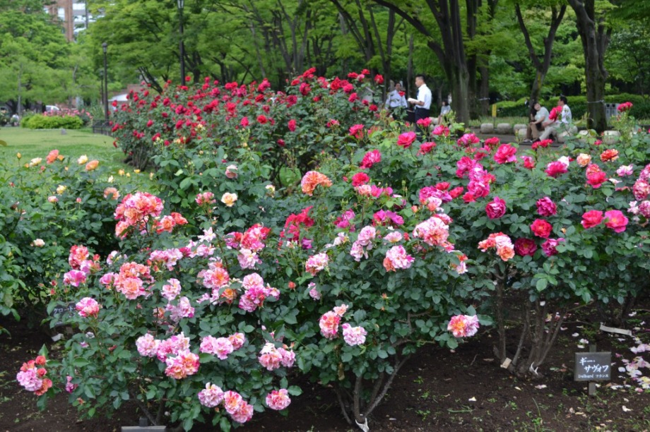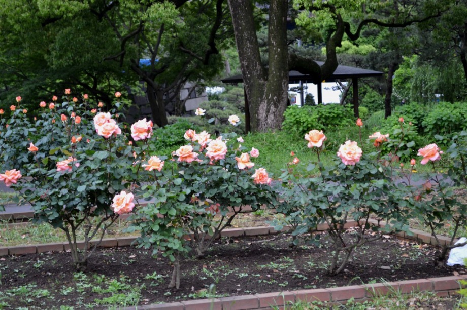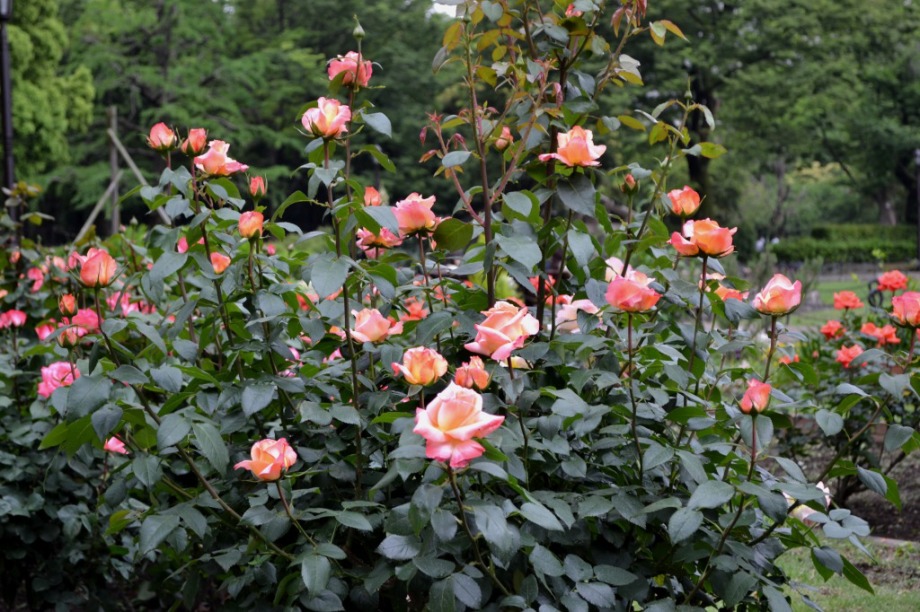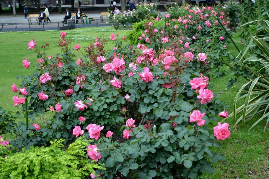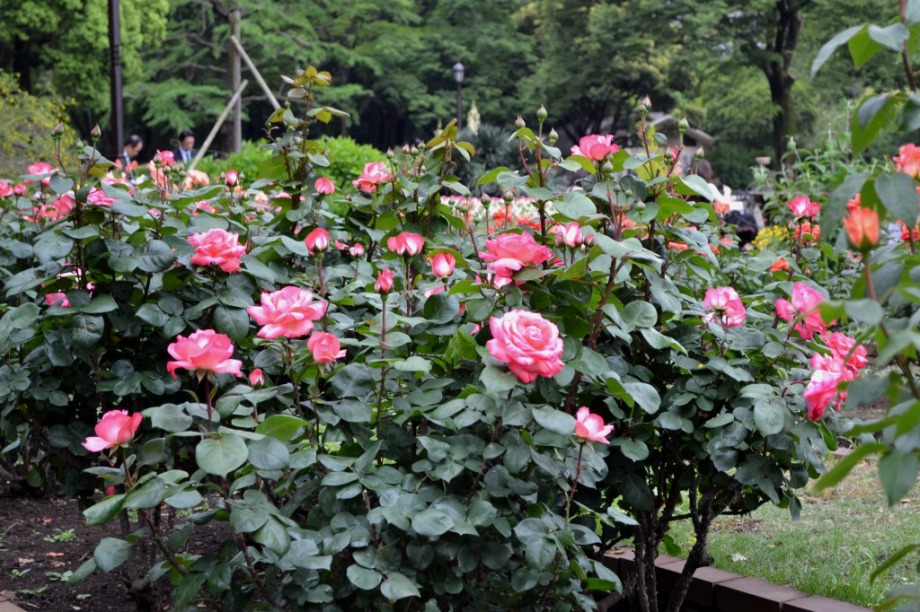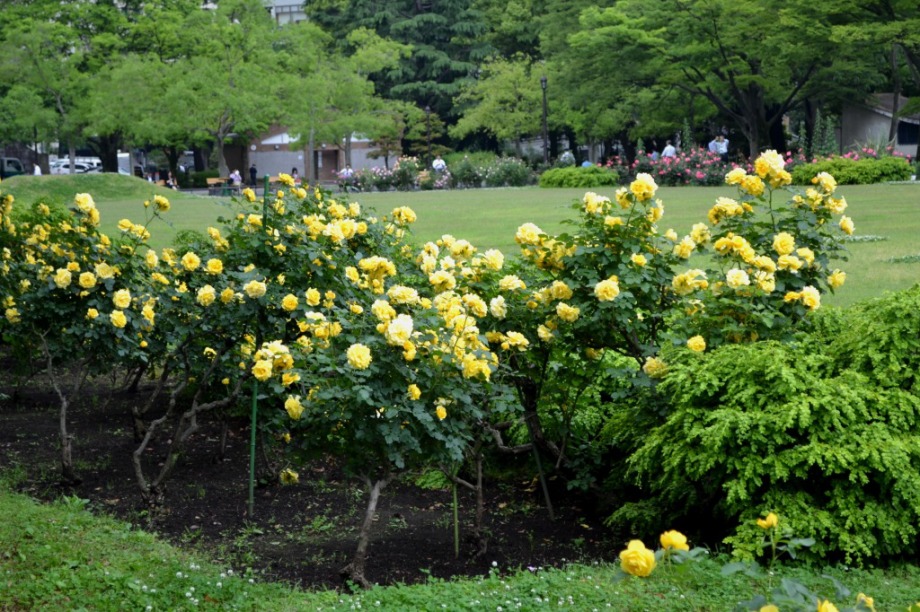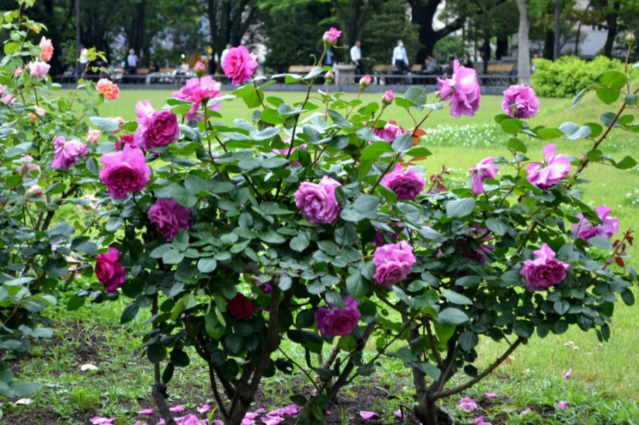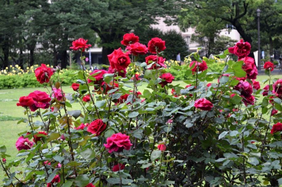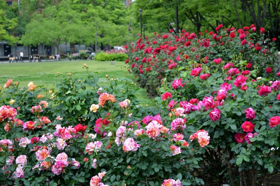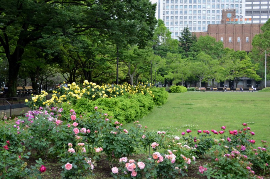 「一言」日比谷公園のバラが一斉に咲き出しました。2つの広場のバラはどちらも見頃です。今回はたくさんバラの花が咲いているので、 たくさん花が咲いている木や風景と一緒に撮影してみました。一つ一つのバラの花も綺麗ですが、今回は省略しました。