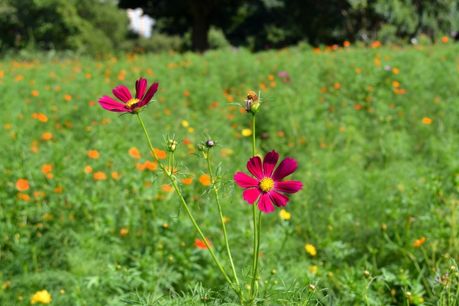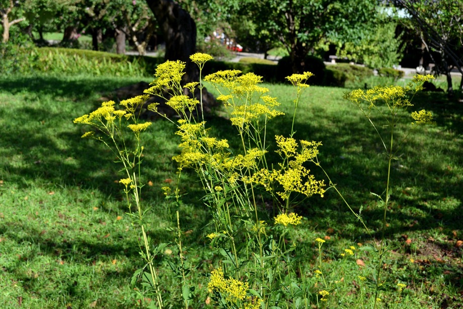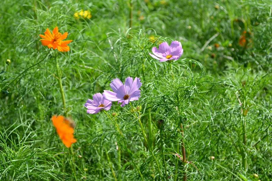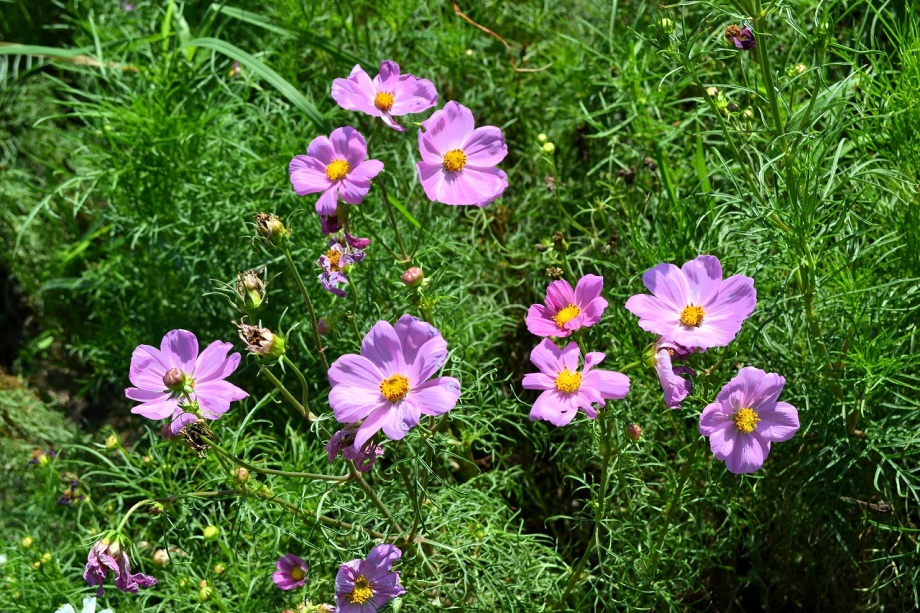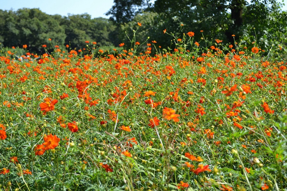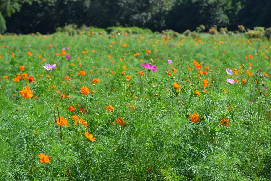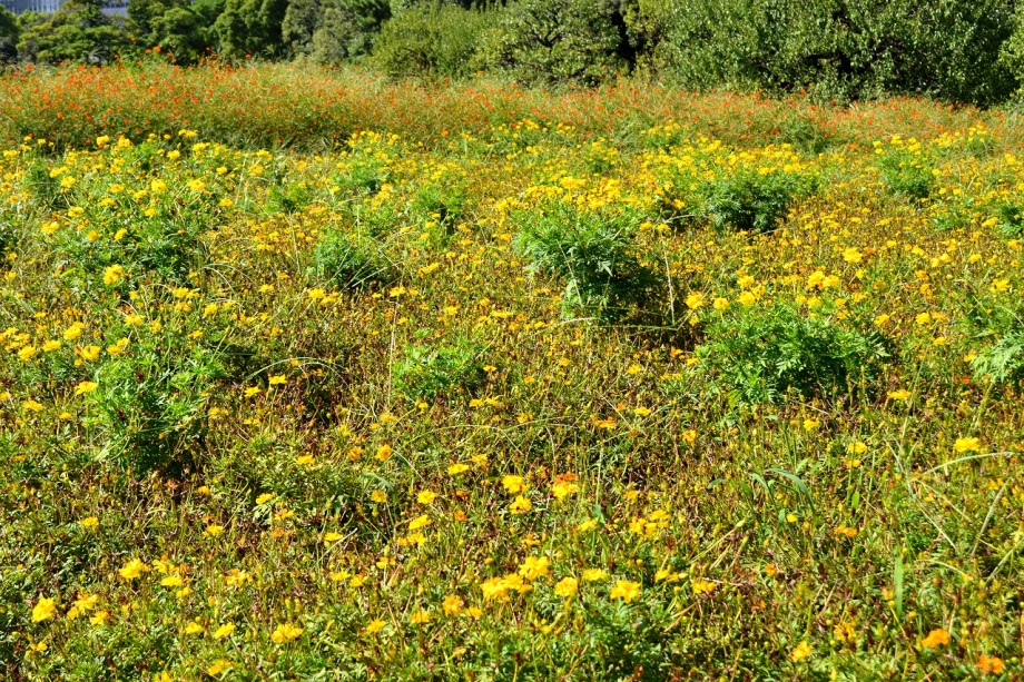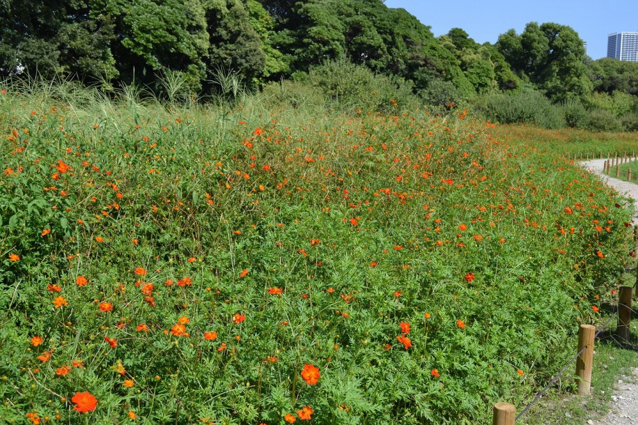 「一言」浜離宮にコスモスの写真を撮りに行きました。キバナコスモスもまだ咲いていましたが、コスモスも咲き始めていて、綺麗でした。 カシワバアジサイの花は緑色になっていました。ヤブミョウガの実がたくさんなっていました。オミナエシの黄色い花が綺麗です。