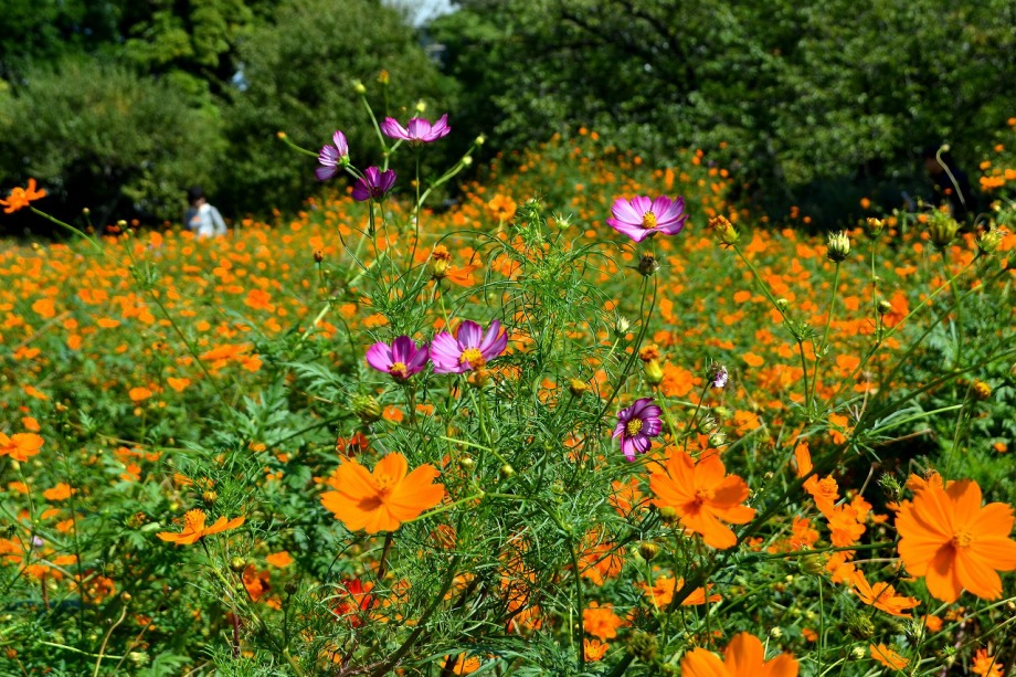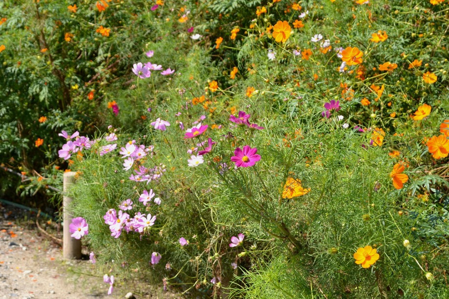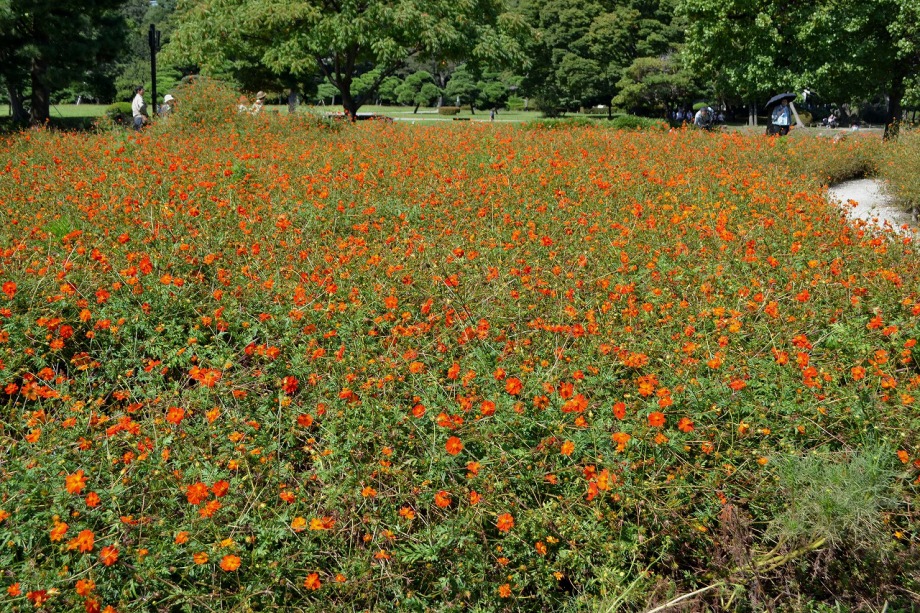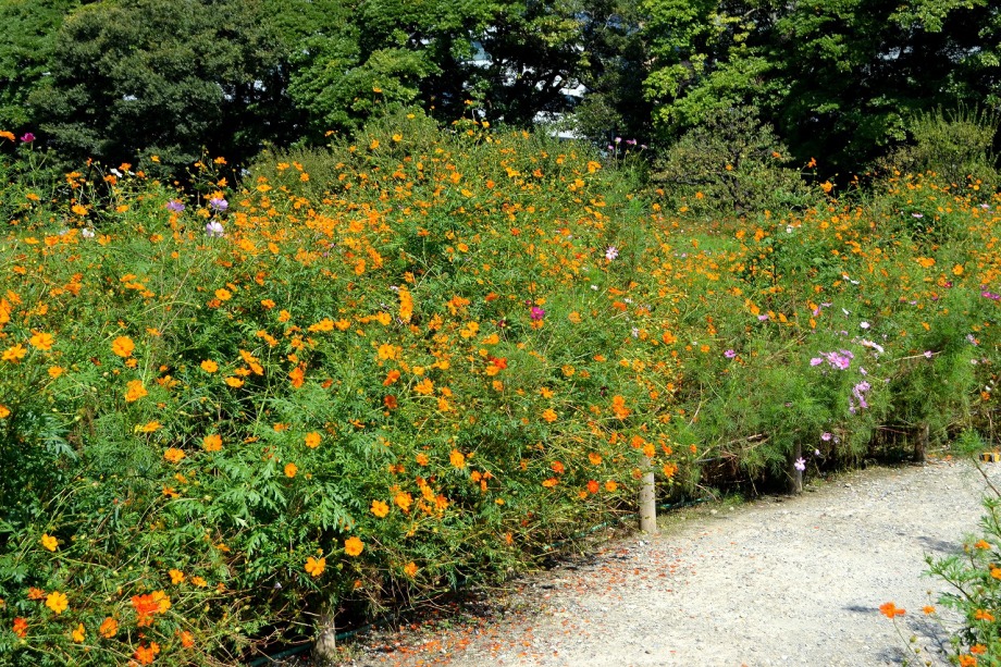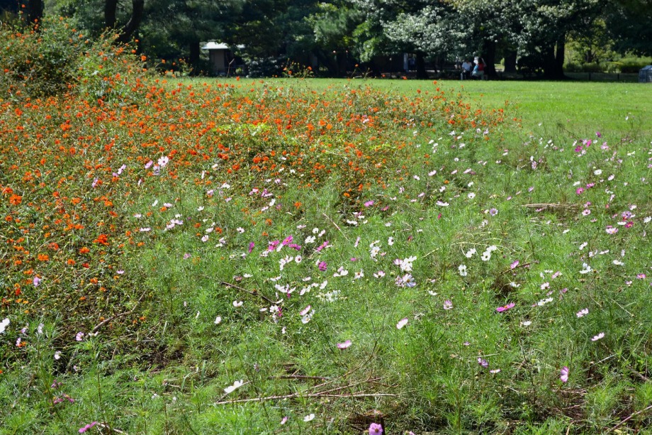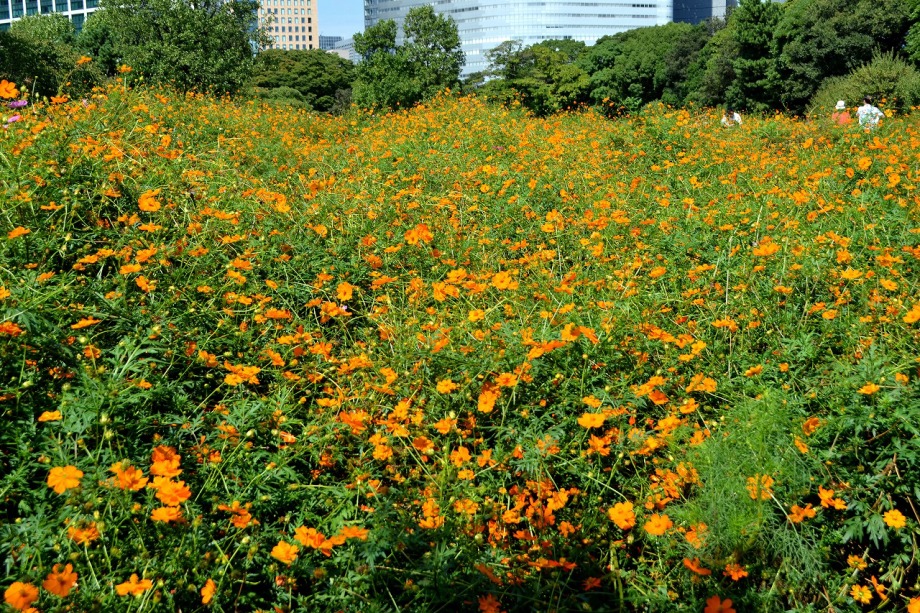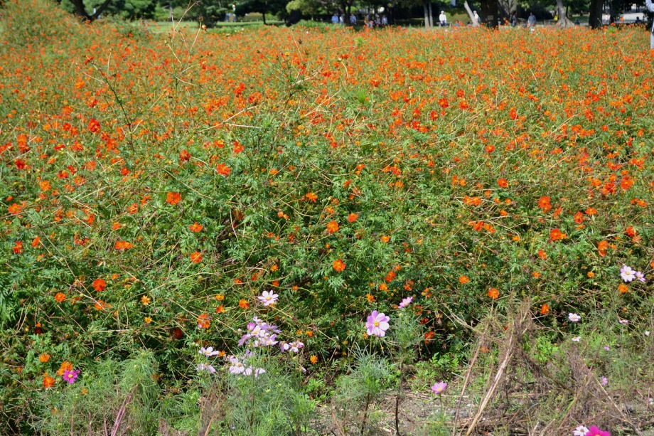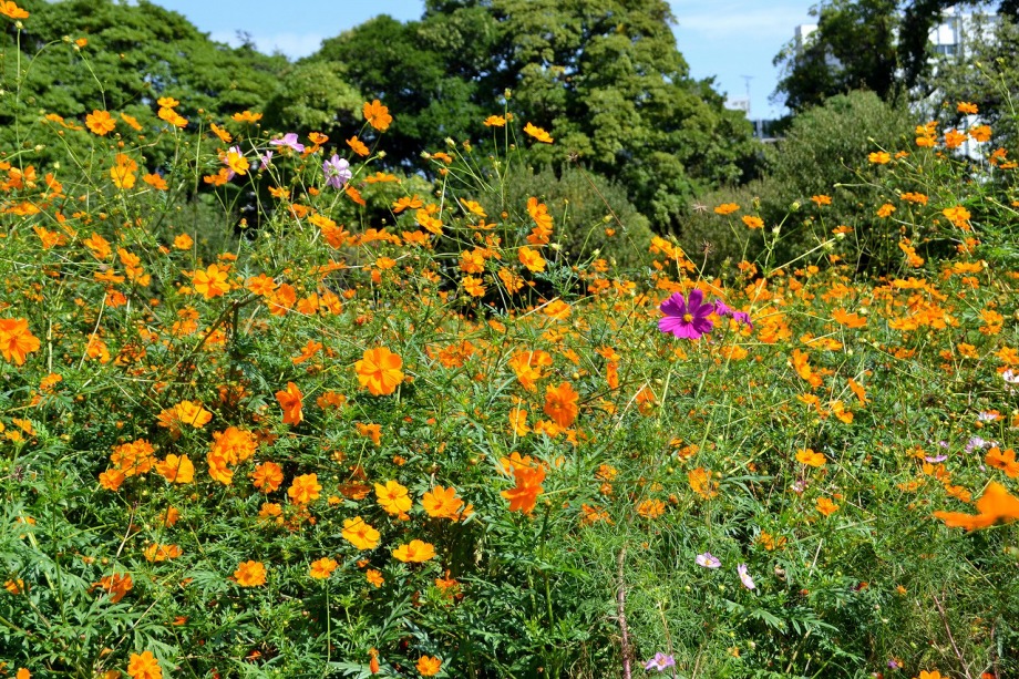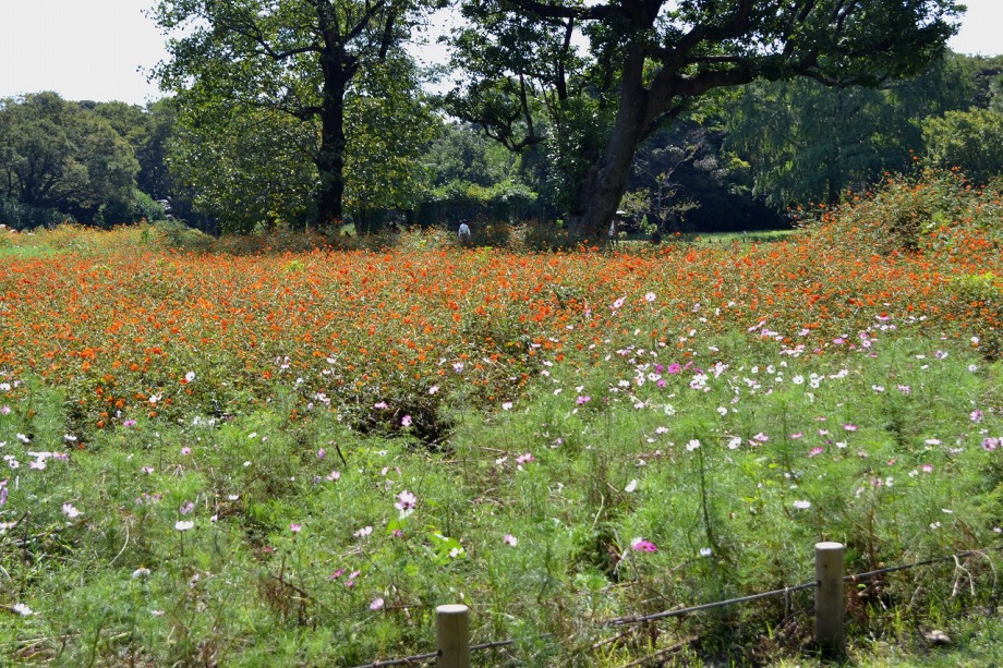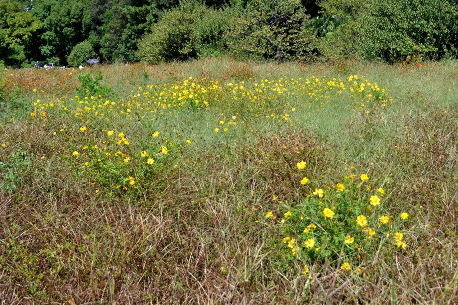 「一言」浜離宮のコスモスが咲き出しました。キバナコスモスもまだたくさん咲いていました。黄色いキバナコスモスも 咲いていました。コスモスはこれから咲き出すという状況ですが、キバナコスモスと可憐なコスモスが一緒に 咲いているのが見られます。公園の奥には大きな萩の木に花が盛りと咲いていました。