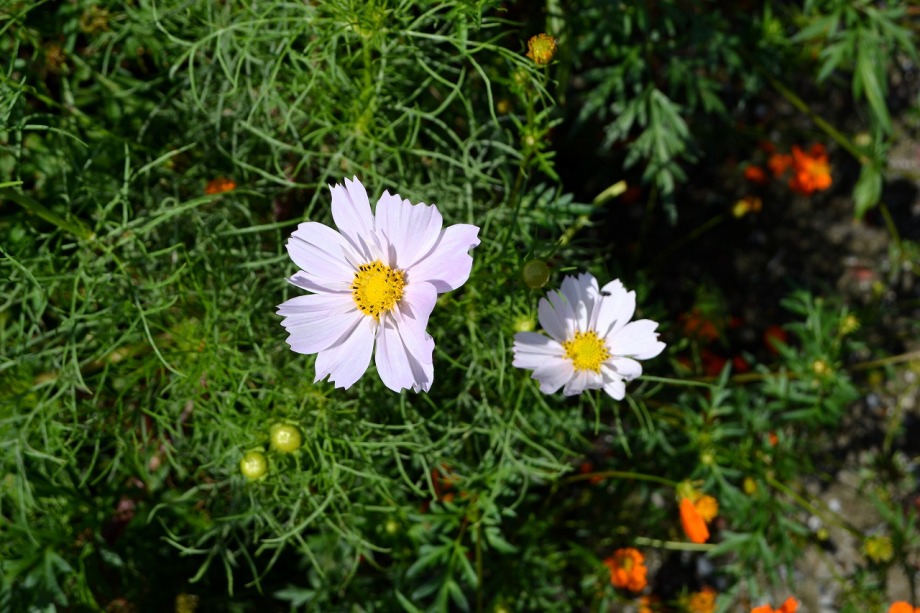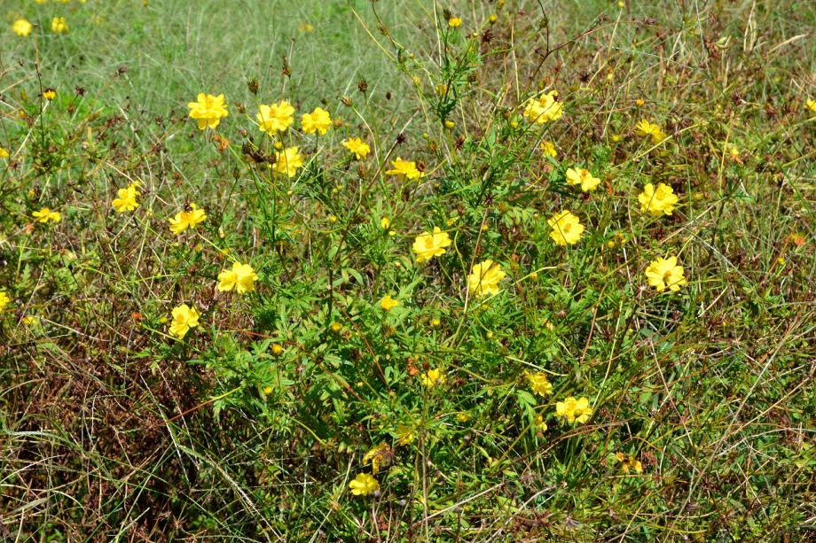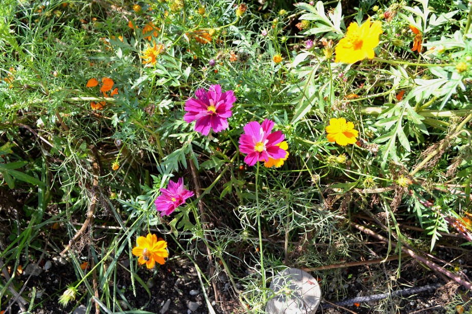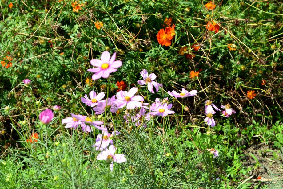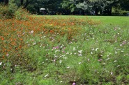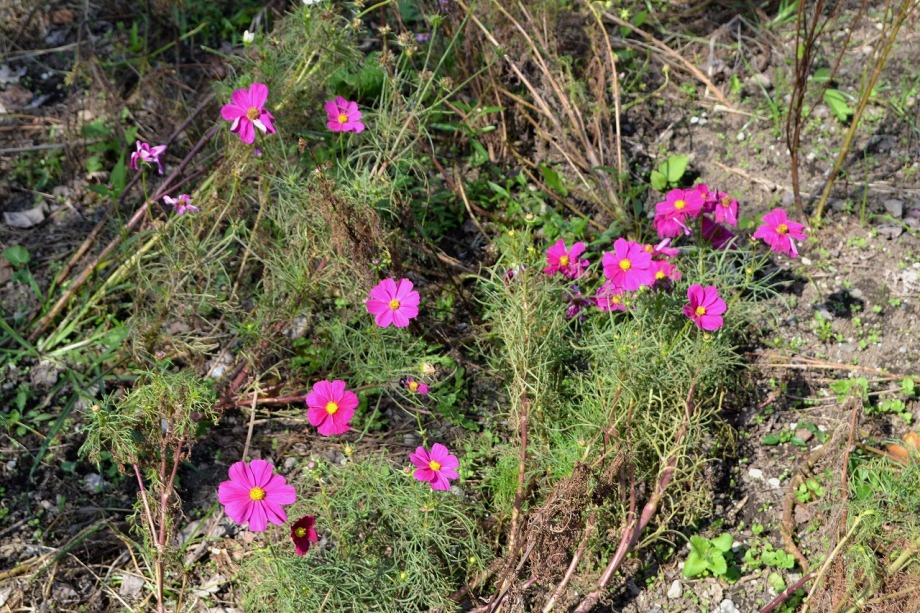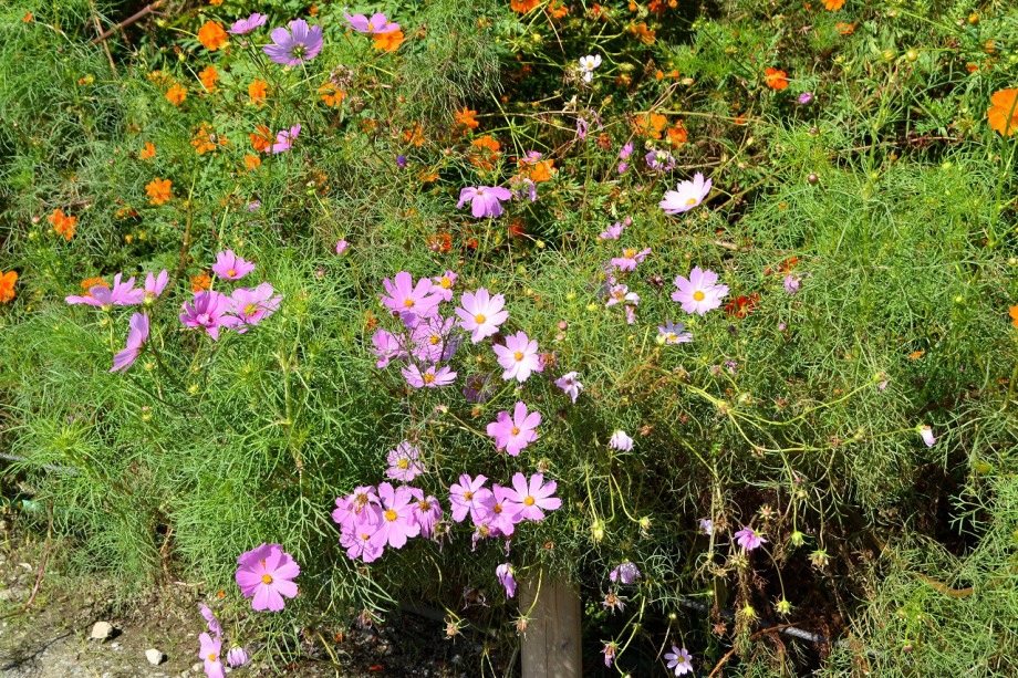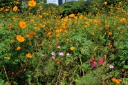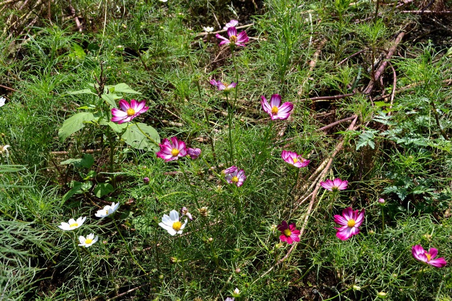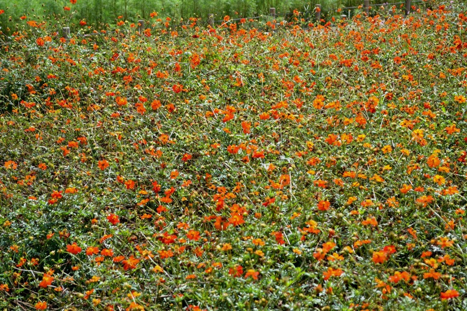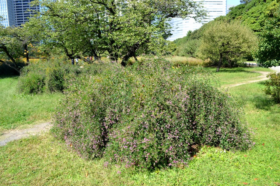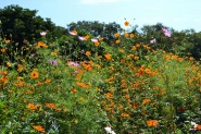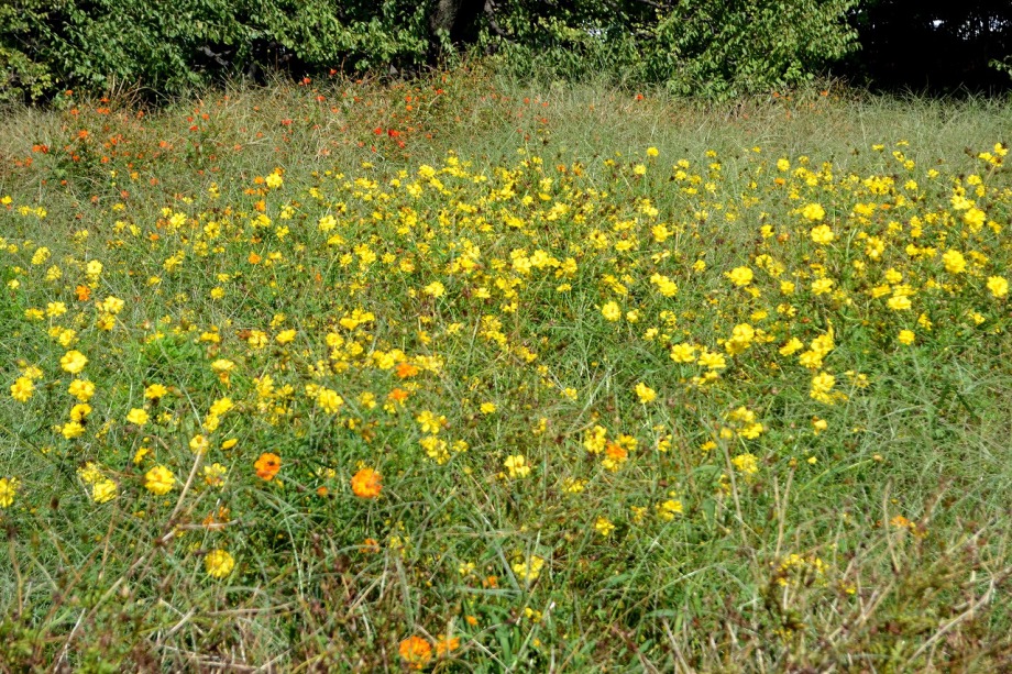「一言」浜離宮のコスモスが咲き出しました。キバナコスモスもまだたくさん咲いていました。黄色いキバナコスモスも 咲いていました。コスモスはこれから咲き出すという状況ですが、キバナコスモスと可憐なコスモスが一緒に 咲いているのが見られます。公園の奥には大きな萩の木に花が盛りと咲いていました。