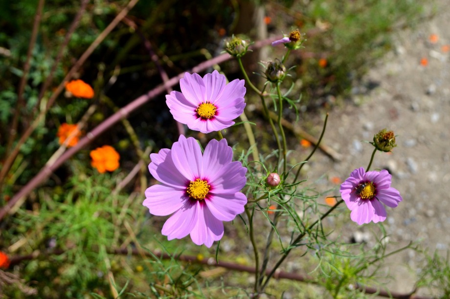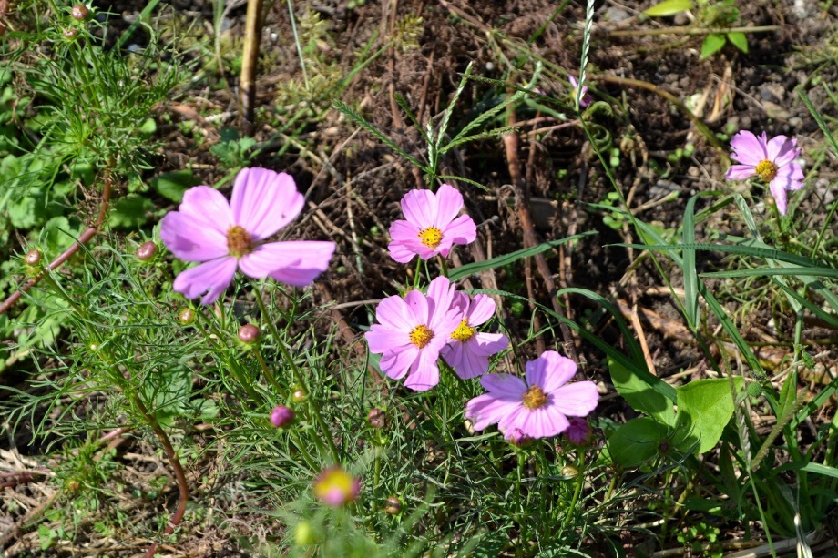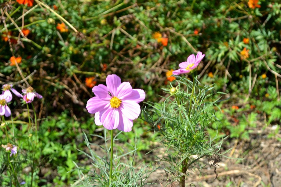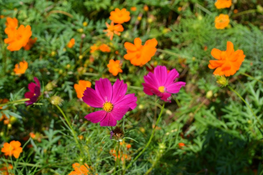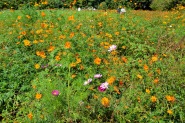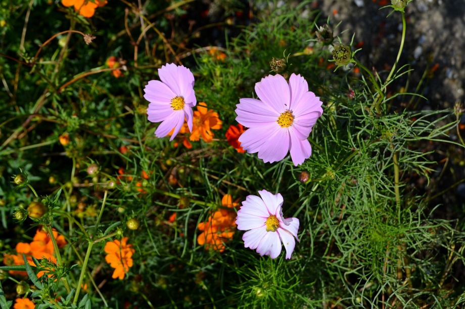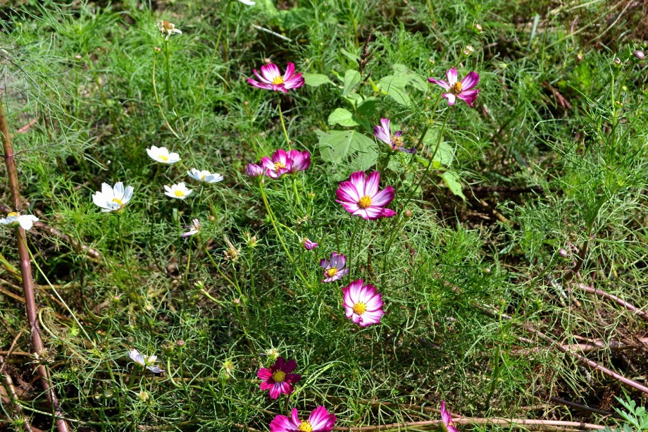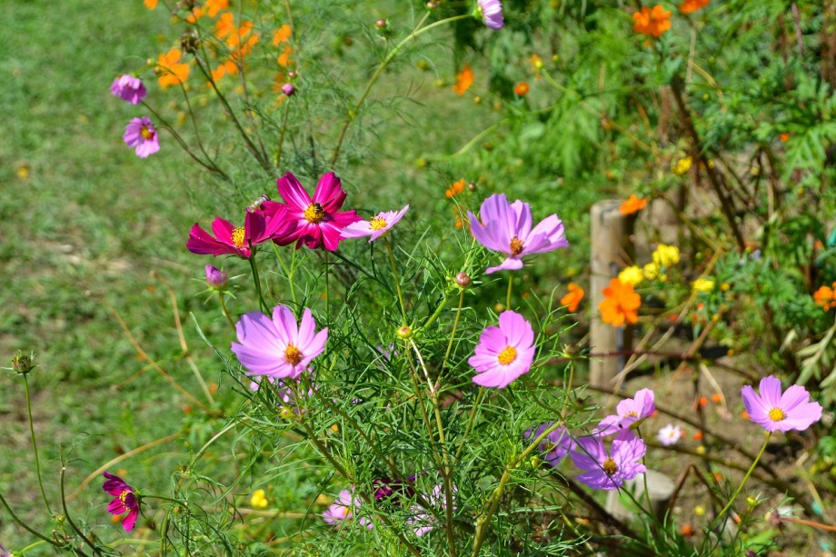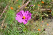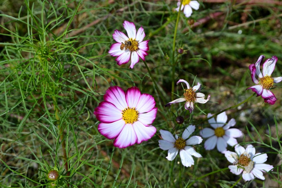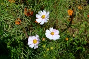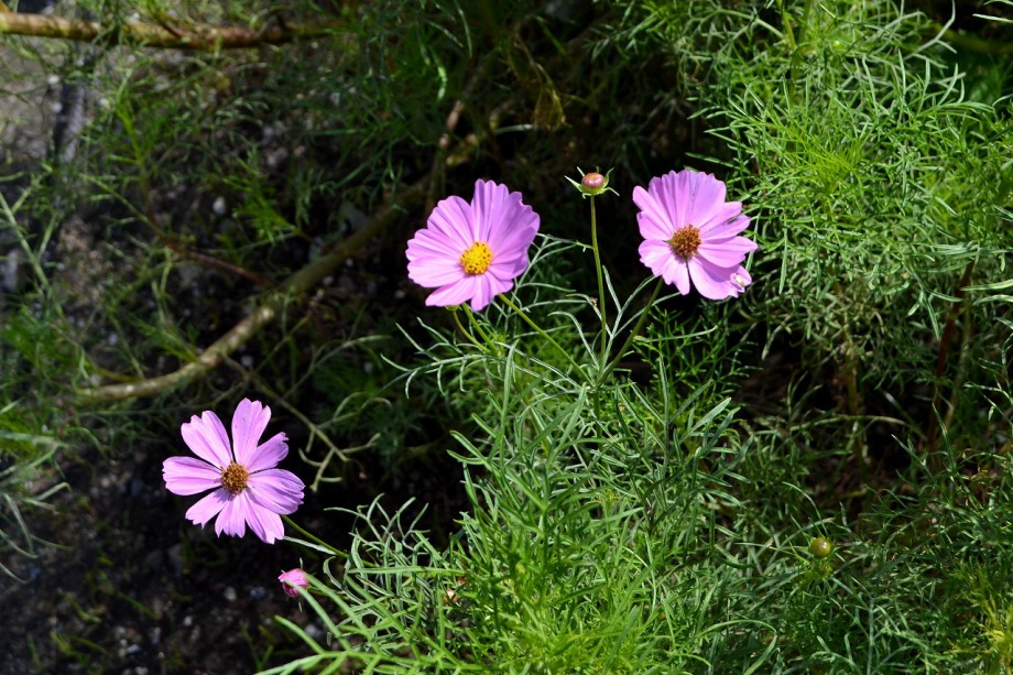 「一言」浜離宮のコスモスが咲き出しました。キバナコスモスもまだたくさん咲いていました。黄色いキバナコスモスも 咲いていました。コスモスはこれから咲き出すという状況ですが、キバナコスモスと可憐なコスモスが一緒に 咲いているのが見られます。公園の奥には大きな萩の木に花が盛りと咲いていました。