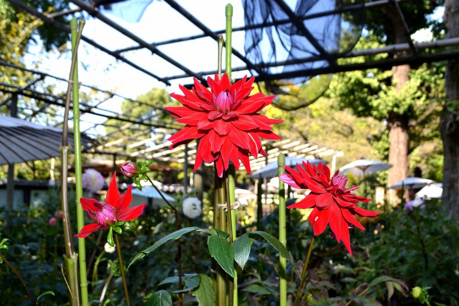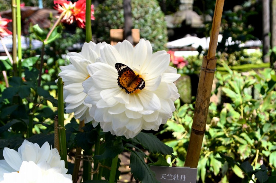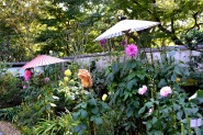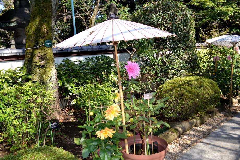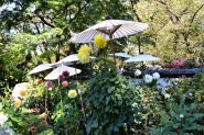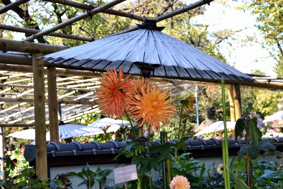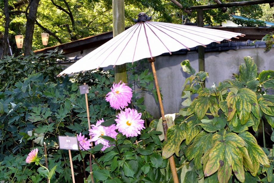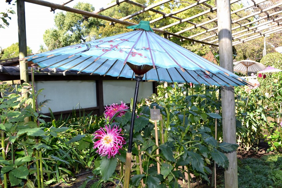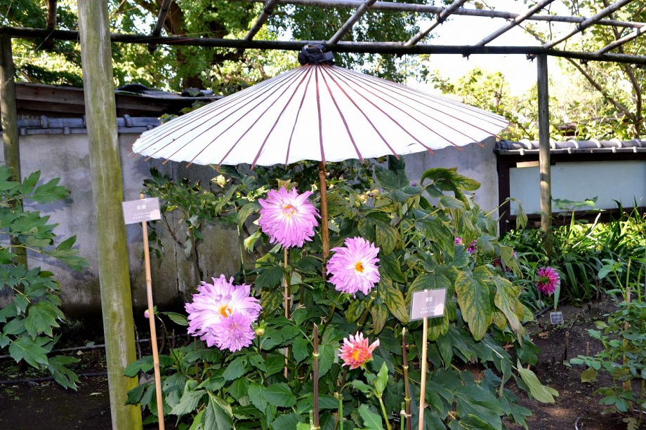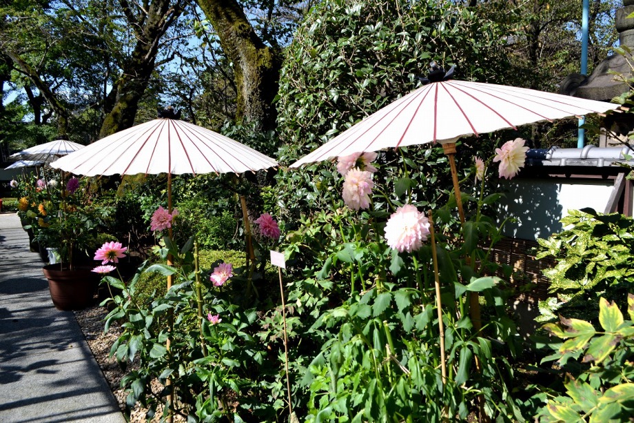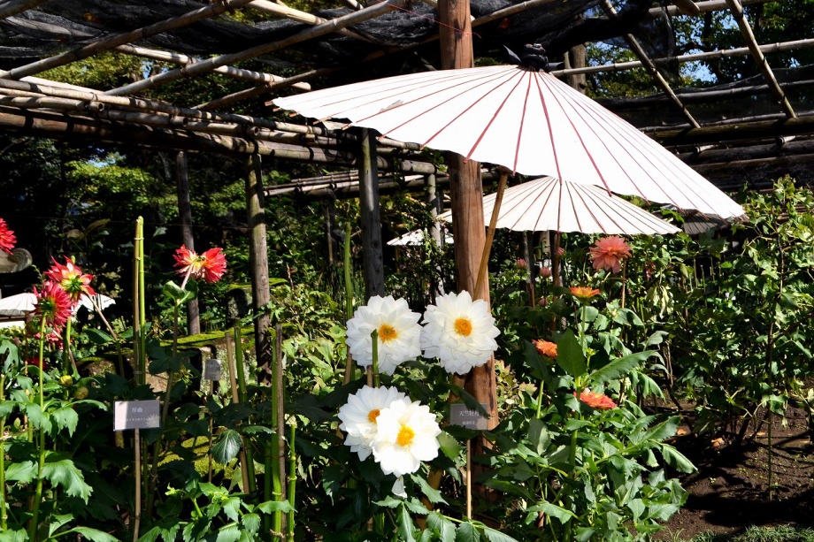 「一言」上野東照宮のぼたん苑で開催されているダリア展を見に行きました。綺麗なダリアの花がたくさん咲いていて綺麗でした。 牡丹の時と同じようにダリアの花には傘をかけていて、面白い雰囲気でした。傘の下で咲いているダリアの花の写真を たくさん撮りましたので、これらの花を中心にまとめました。ダリアの花に蝶が止まって蜜を吸っていました。