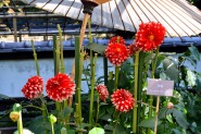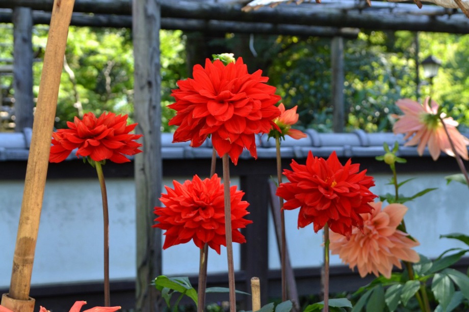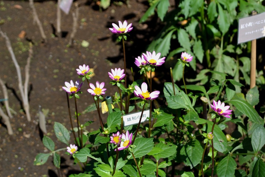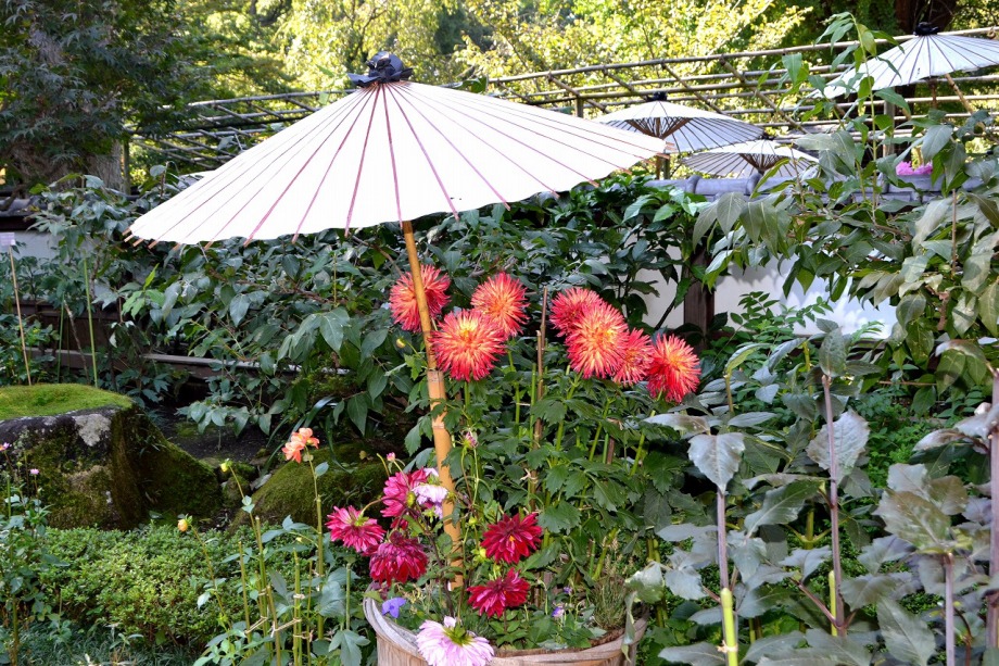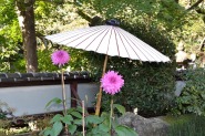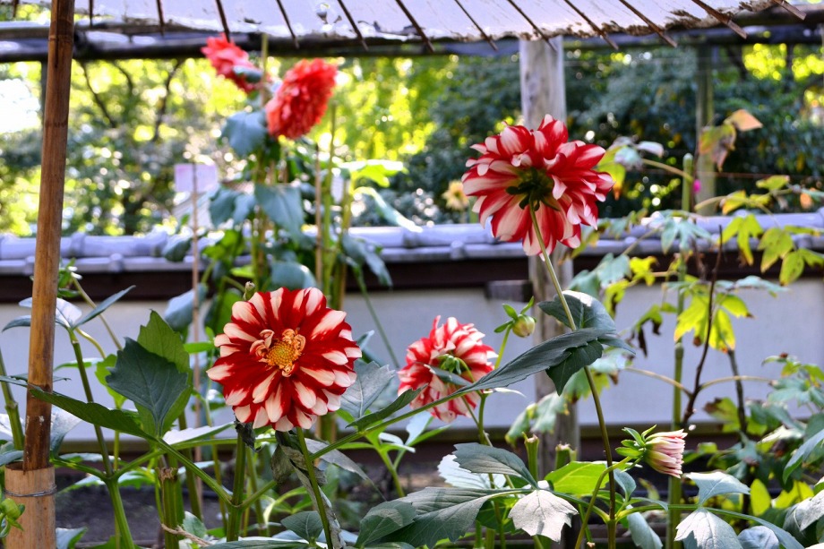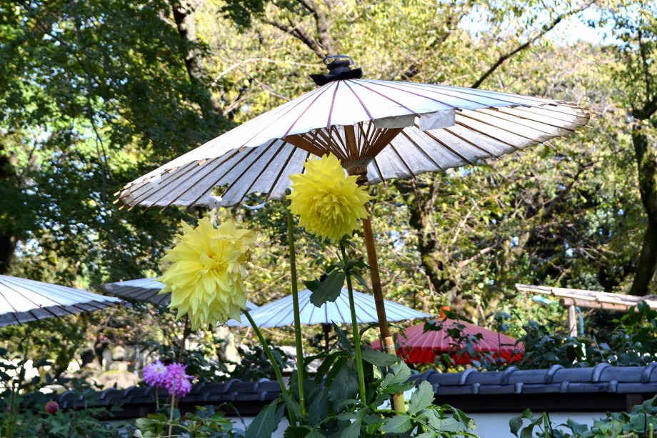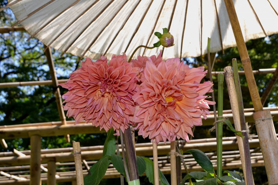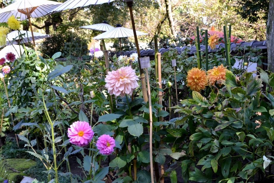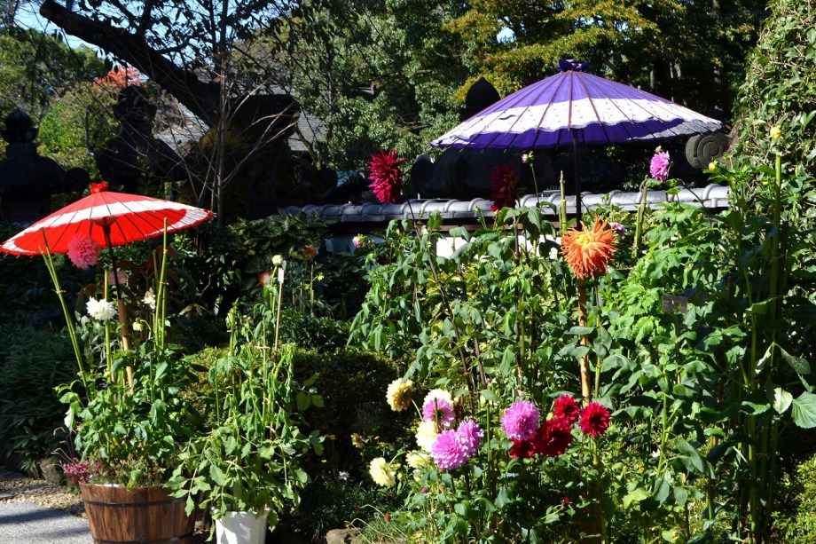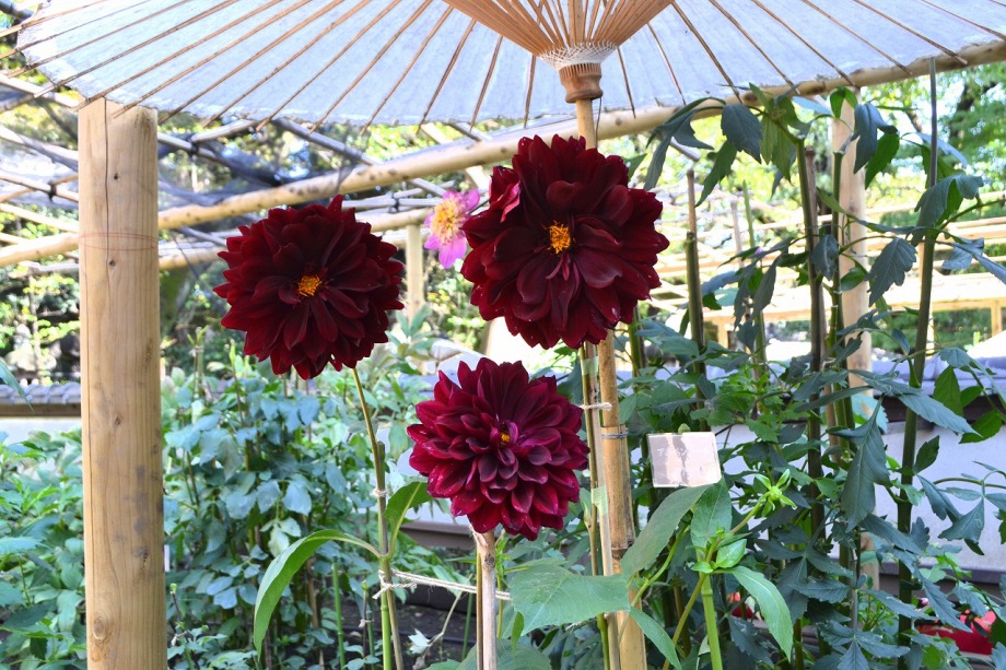 「一言」上野東照宮のぼたん苑で開催されているダリア展を見に行きました。綺麗なダリアの花がたくさん咲いていて綺麗でした。 牡丹の時と同じようにダリアの花には傘をかけていて、面白い雰囲気でした。傘の下で咲いているダリアの花の写真を たくさん撮りましたので、これらの花を中心にまとめました。ダリアの花に蝶が止まって蜜を吸っていました。