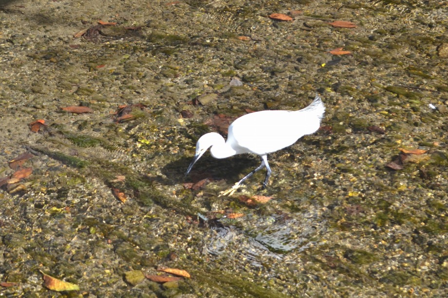 ました。高瀬川にシラサギが止まって魚を取っていました。