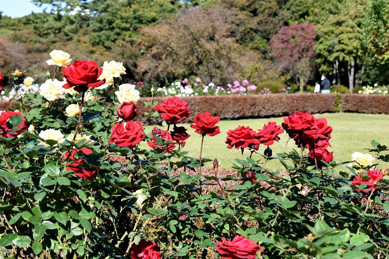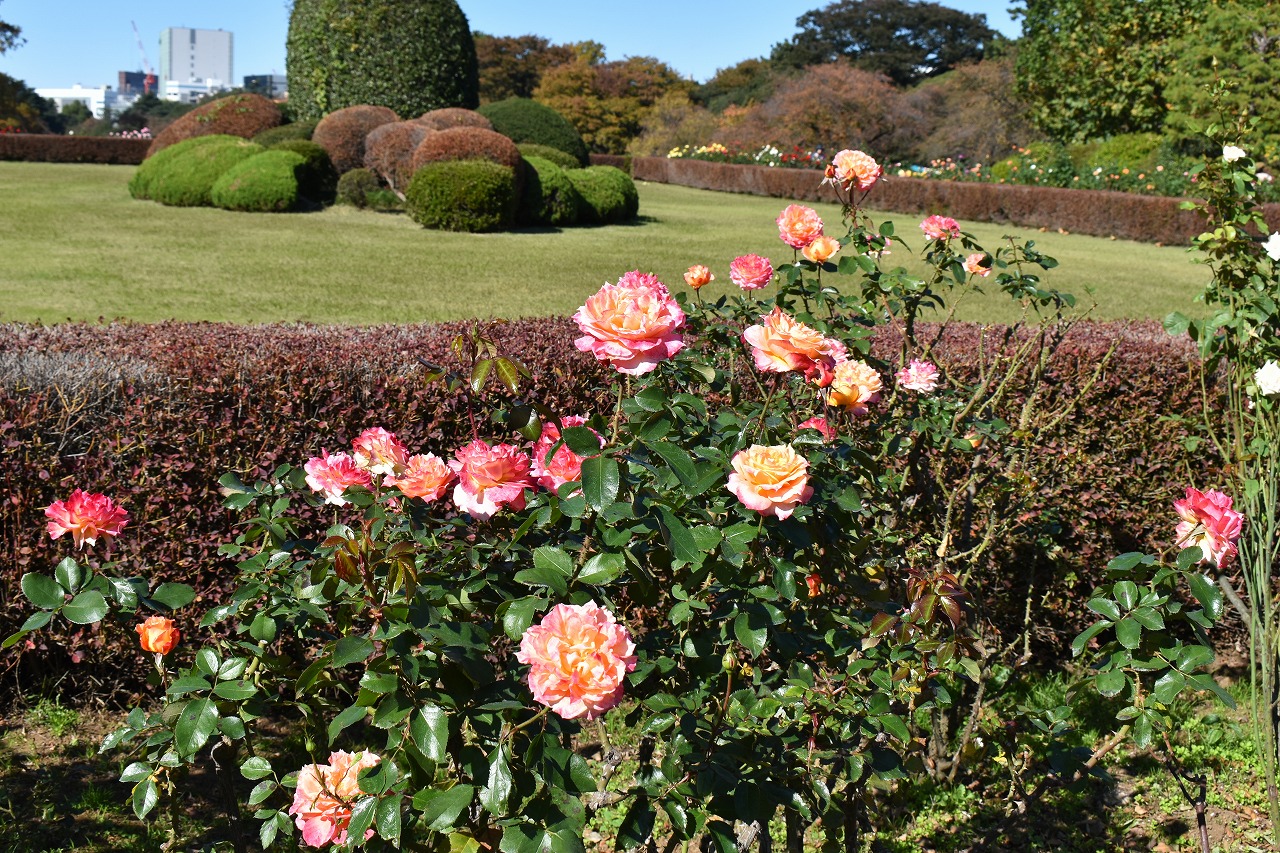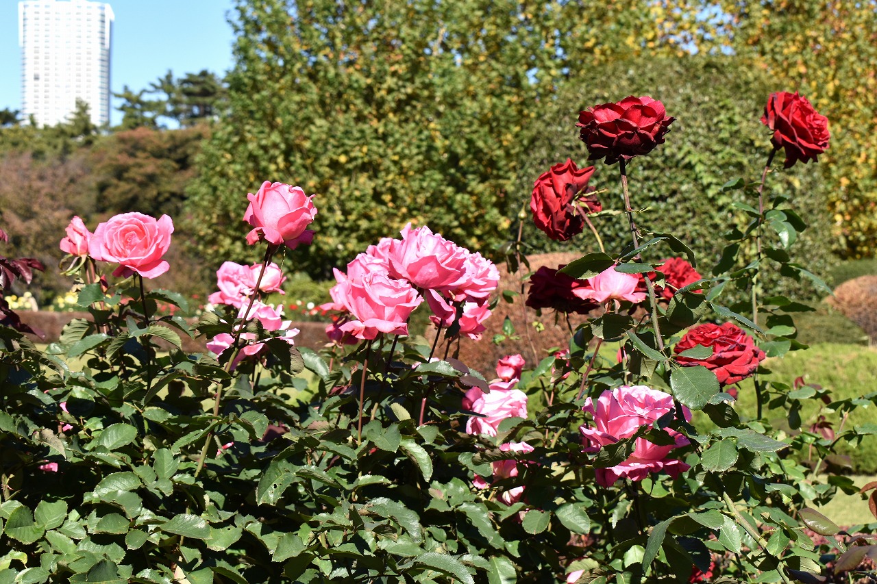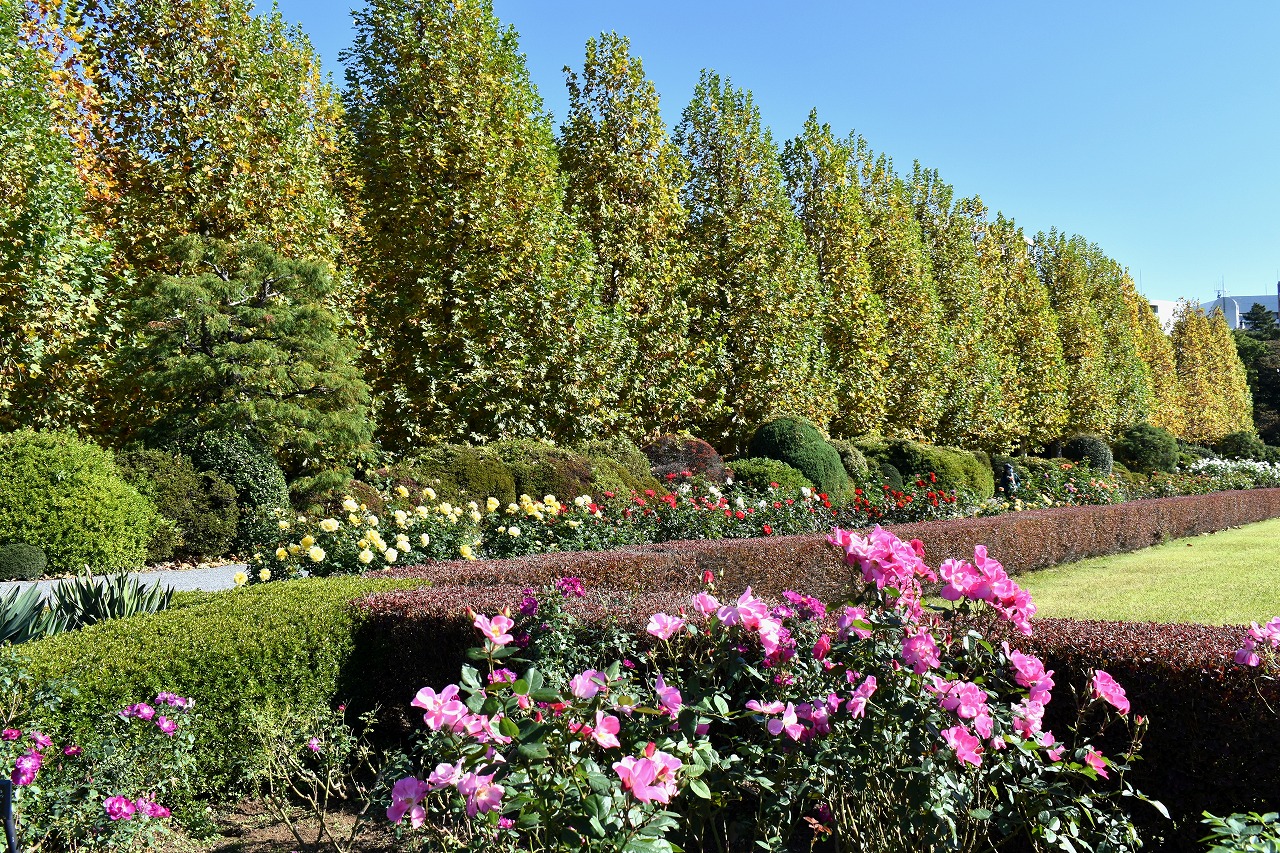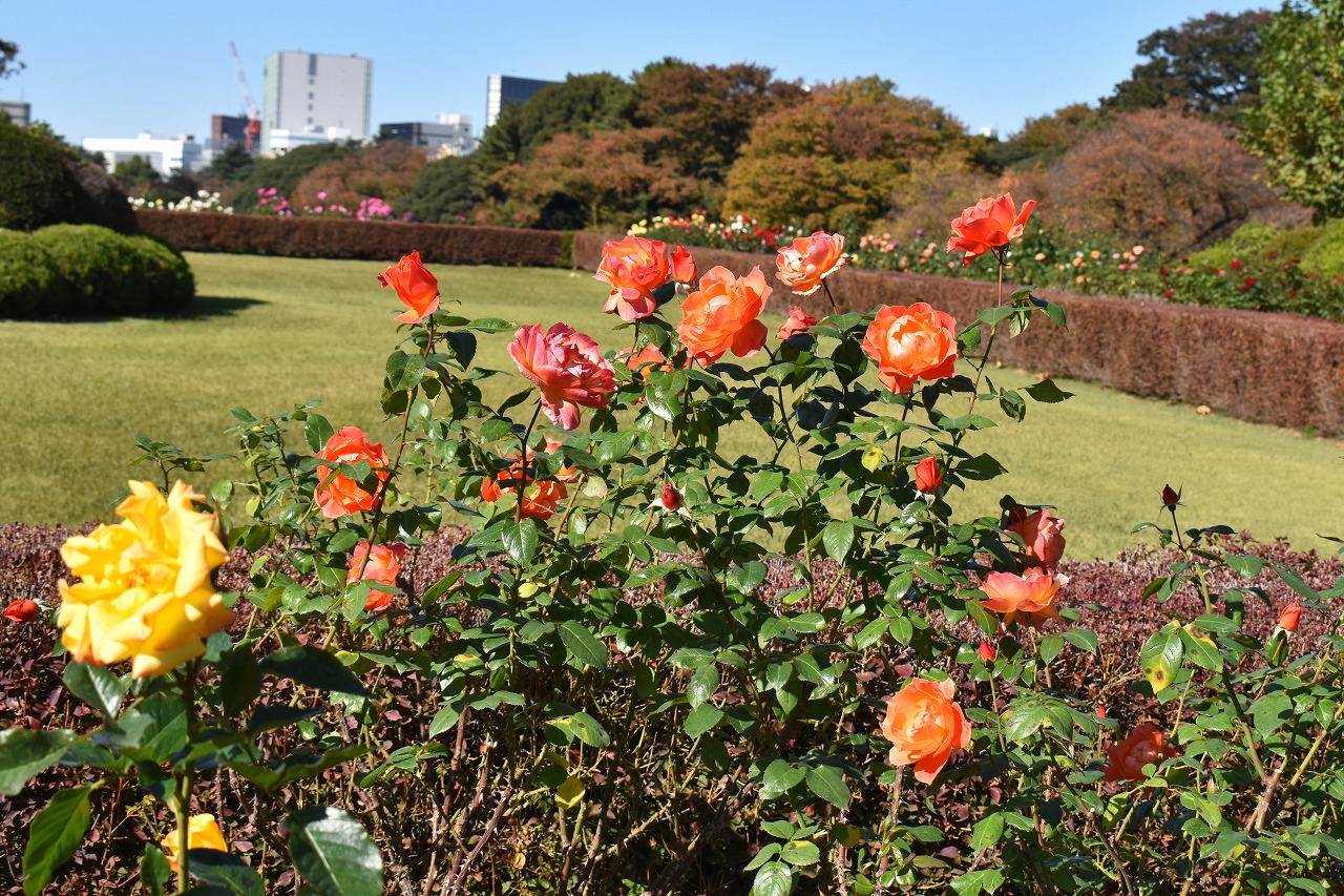 「一言」新宿御苑に行きました。今年は銀杏の黄葉が遅れていてまだまだイチョウの葉は青い状況でした。 バラ園に行くとバラの花が遅れていて、色々な色のバラの花がたくさん咲いて見頃という状況でした。 綺麗な花がたくさん咲いていましたので写真を撮りました。つつじやつわぶきなどの花も咲いていました。