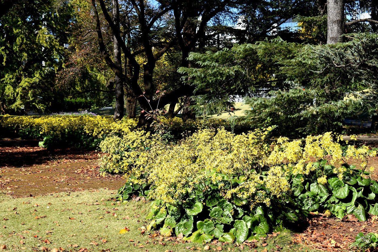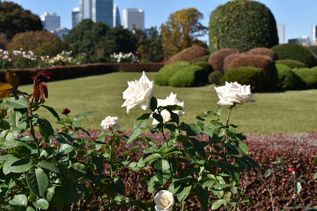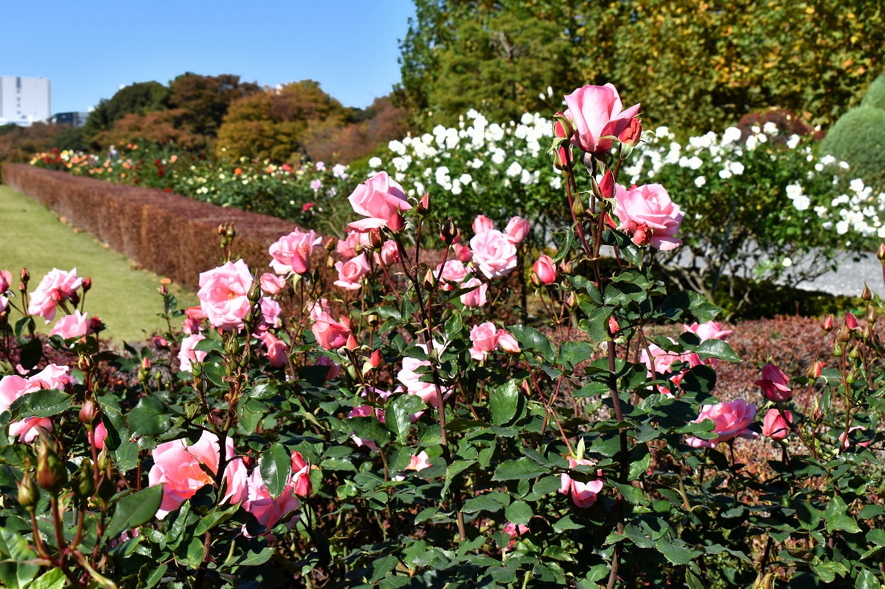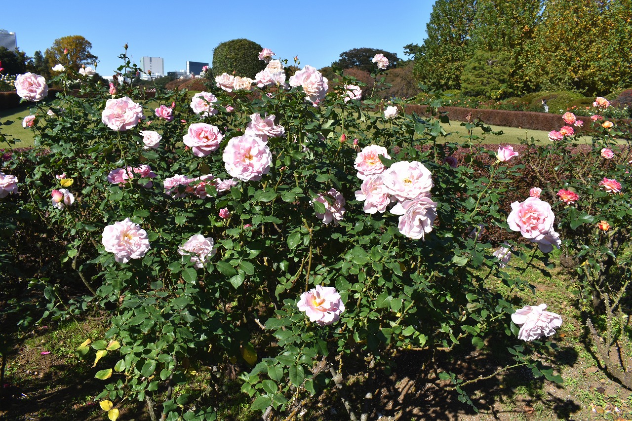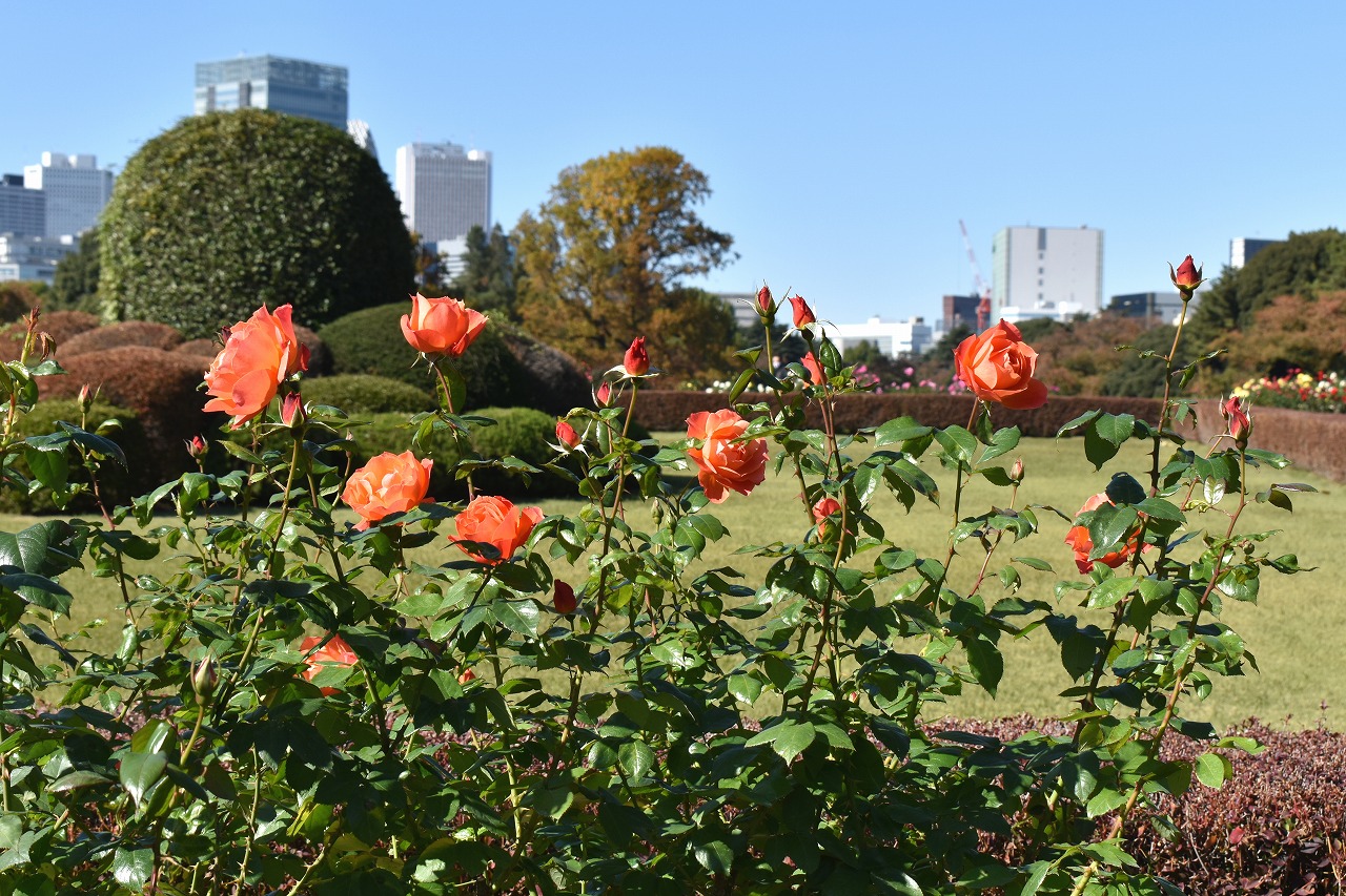 「一言」新宿御苑に行きました。今年は銀杏の黄葉が遅れていてまだまだイチョウの葉は青い状況でした。 バラ園に行くとバラの花が遅れていて、色々な色のバラの花がたくさん咲いて見頃という状況でした。 綺麗な花がたくさん咲いていましたので写真を撮りました。つつじやつわぶきなどの花も咲いていました。